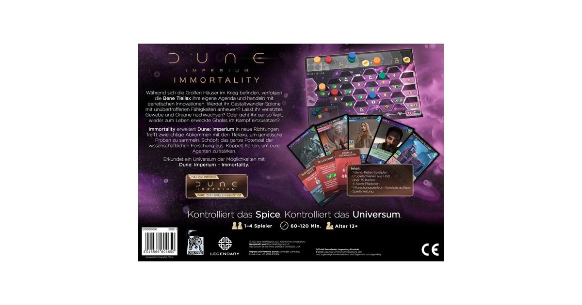 Im Krieg der Großen Häuser verfolgen die Bene Tleilax ihre eigenen Pläne und handeln mit genetischen Innovationen. Wer rekrutiert Gestaltwandler-Spione mit unübertroffenen Fähigkeiten? Gelingt es, verletztes Gewebe und Organe nachwachsen zu lassen? Oder werden sogar wiederbelebte Gholas im Kampf eingesetzt? Immortality ist die zweite Erweiterung zu Dune: Imperium. Die neue Fraktion der Bene Tleilax bringt mit dem zusätzlichen Spielplan neue strategische Möglichkeiten ins Spiel. Eine Vielzahl von Imperiums- und Tleilaxu-Karten fügt neue Konzepte hinzu und erweitern auch die bestehenden Fraktionen um neue Effekte.
