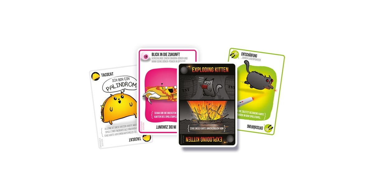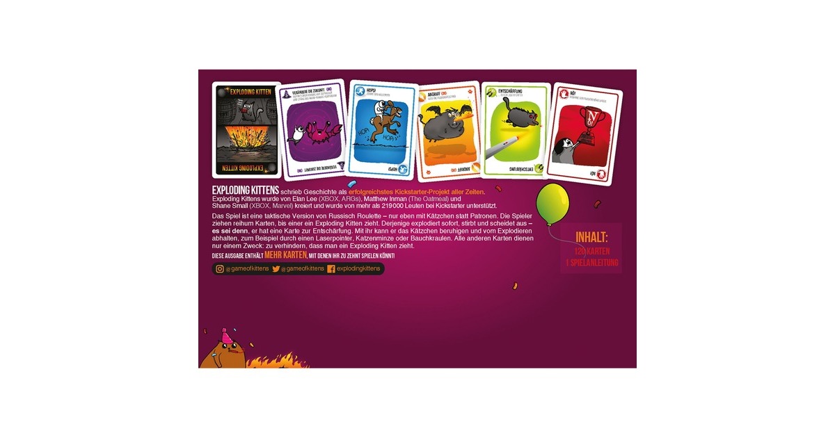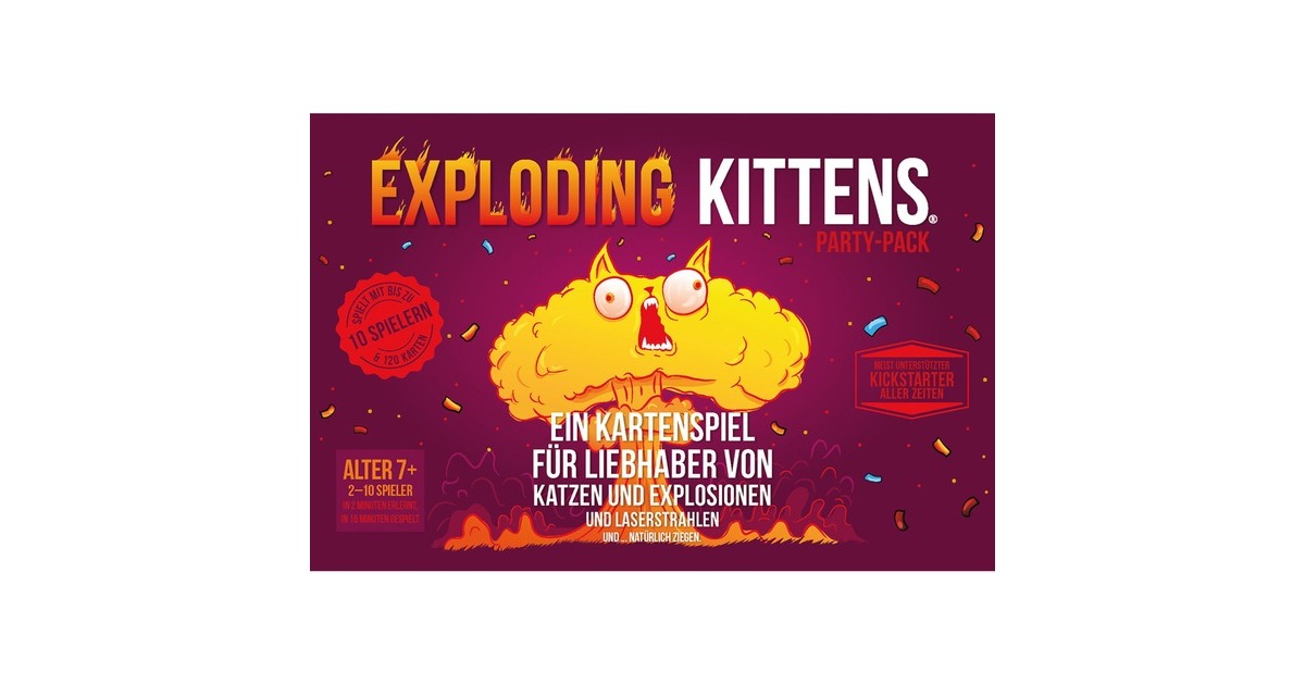 Ihr liebt Katzen mit spanischem Flair? Dann öffnet die ultimative Party-Box der Exploding Kittens und crasht ihre Party. Die Kittens veranstalten eine Riesen Sause! ARRRIIBBBAA! Der erfolgreiche Kickstarter jetzt als Party Pack! Für jeden Exploding Kittens-Fan ein Must-have. Exploding Kittens Party Pack ist eine spezielle Box, die jedes Mal Party-Musik spielt und miaut, wenn sie geöffnet wird. ARRRRRIBBBAA! Wer Exploding Kittens kennt und ein Fan ist, der weiß wie es funktioniert. Doch hier nochmal für euch. Die Spieler ziehen reihum Karten, bis einer ein Exploding Kitten zieht. Derjenige explodiert sofort, stirbt und scheidet aus – es sei denn, er hat eine Karte zur Entschärfung. Mit ihr kann er das Kätzchen beruhigen und vom Explodieren abhalten, zum Beispiel mithilfe eines Laserpointers, Katzenminze oder durch Bauchkraulen. Alle anderen Karten dienen nur einem Zweck: zu verhindern, dass man ein Exploding Kitten zieht.Art.-Nr.: 1727259