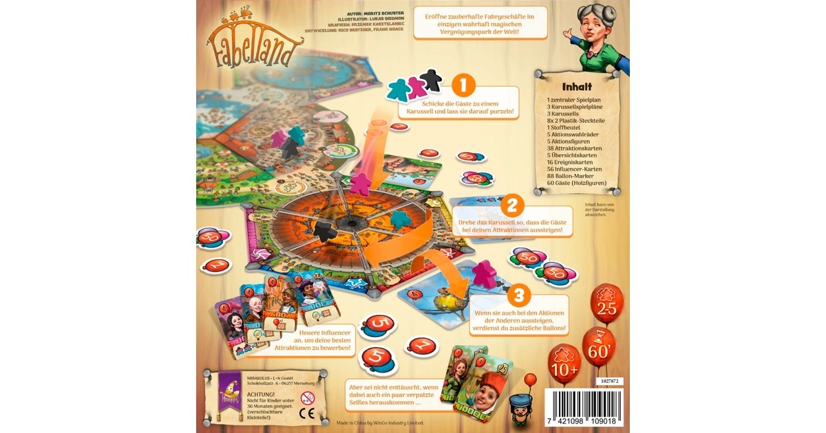Willkommen in Fabelland! Fabelland ist ein Themenpark mit unglaublichen Attraktionen - früher war er nur Superhelden vorbehalten, aber nun ist er für alle geöffnet! Ziel des Spiels ist es dabei nicht, möglichst viel Geld zu verdienen: Statt dessen müssen möglichst viele Gäste glücklich gemacht werden. Eröffne zauberhafte Fahrgeschäfte, heuere Influencer als Werbung an und gewinne schließlich die meisten Ballons. Ein fabelhaftes Spiel für 2-5 Spieler ab 10 Jahren. Art.-Nr.: 100045210