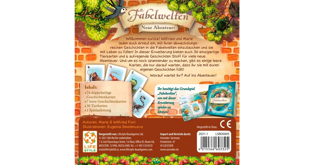 Neue Abenteuer ist eine Erweiterung zum kooperativen Kinderspiel Fabelwelten. Sie enthält 30 neue Tierkarten und sechs Geschichten - reichlich Stoff für viele neue Abenteuer. Mit dabei sind außerdem einige leere Karten, die mit eigenen Ideen gefüllt werden können. Art.-Nr.: 1902289