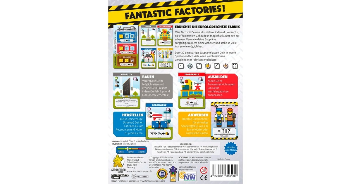 Für Kreative und sehr einsteigerfreundlich: "Fantastic Factories" kombiniert Engine-Building mit Dice-Placement. Die Spieler bauen Farbriken auf ihrem Gelände und nutzen dann die Würfel, um Arbeiter einzusetzen. Dabei gibt es immer wieder neue Möglichkeiten zu entdecken: 35 Baupläne ergeben jede Menge Optionen, wie die Fabriken zusammenarbeiten können. Bis zu 5 Spieler können teilnehmen - auch eine Solo-Variante ist enthalten. Art.-Nr.: 100045218