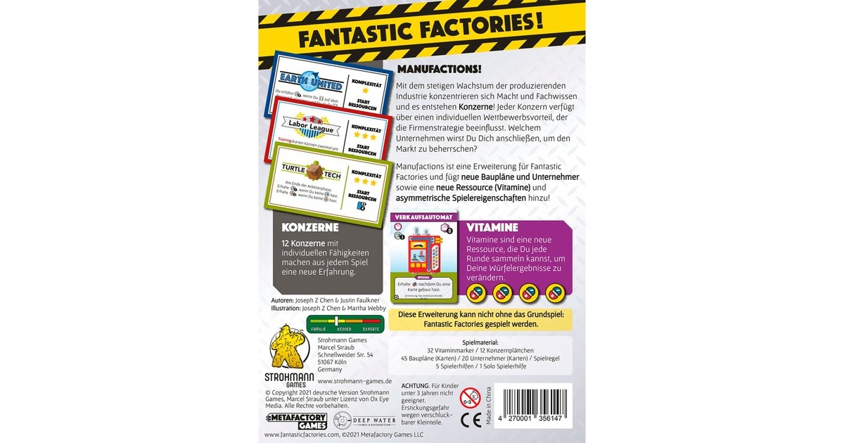 "Fantastic Factories - Manufactions" ist eine Erweiterung für "Fantastic Factories". Dieses Set fügt neue Baupläne und Unternehmer zum Grundspiel hinzu. Außerdem gibt es eine neue Ressource - die Vitamine. Asymmetrisch Spielereigenschaften sorgen außerdem für neue Möglichkeiten. Art.-Nr.: 100045219
