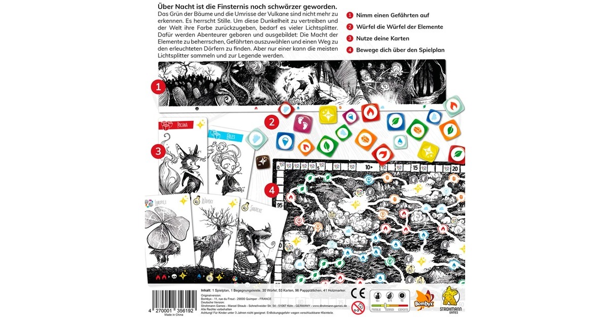 Das Grün der Bäume und die Umrisse der Vulkane sind nicht mehr zu erkennen. Es herrscht Stille. Um diese Dunkelheit zu vertreiben und der Welt ihre Farbe zurückzugeben, bedarf es vieler Lichtsplitter. Dafür werden Abenteurer geboren und ausgebildet: Die Macht der Elemente zu beherrschen, Gefährten auszuwählen und einen Weg zu den erleuchteten Dörfern zu finden. Aber nur einer kann die meisten Lichtsplitter sammeln und zur Legende werden. "Glow" ist ein wunderschön gestaltetes Spiel mit atmosphärischen Illustrationen. Der Spielplan ist doppelseitig, so dass sich zwei verschiedene Varianten - "Reich der Schatten" und "Meer der Finsternis" - spielen lassen. "Glow" kombiniert dabei geschickt die Elemente eines Karten-, Würfel- und Kombinationsspiels, um sich auf dem Spielplan zu bewegen.
