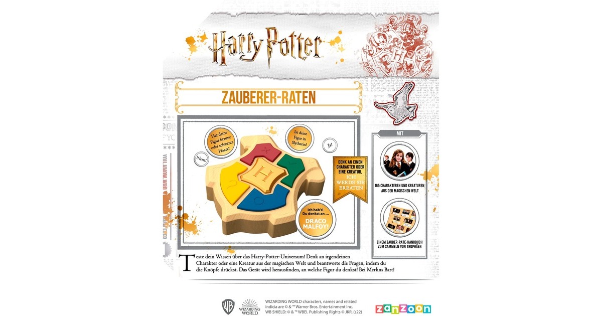 Harry Potter - Zauberer-Raten ist in Ratespaß für echte Harry-Potter-Fans. Einfach an einen Charakter oder eine Kreatur aus der magischen Welt und die Fragen beantworten, in dem die Knöpfe des Wappens gedrückt werden. Das Gerät wird dann erraten, an welche Figur gedacht wurde. Mit dem beiliegenden Zauber-Rate-Handbuch geht es gleichzeitig auf die Jagd nach Trophäen. Insgesamt gibt es 165 Figuren aus dem Universum von Harry Potter zu erraten. Art.-Nr.: 1902299