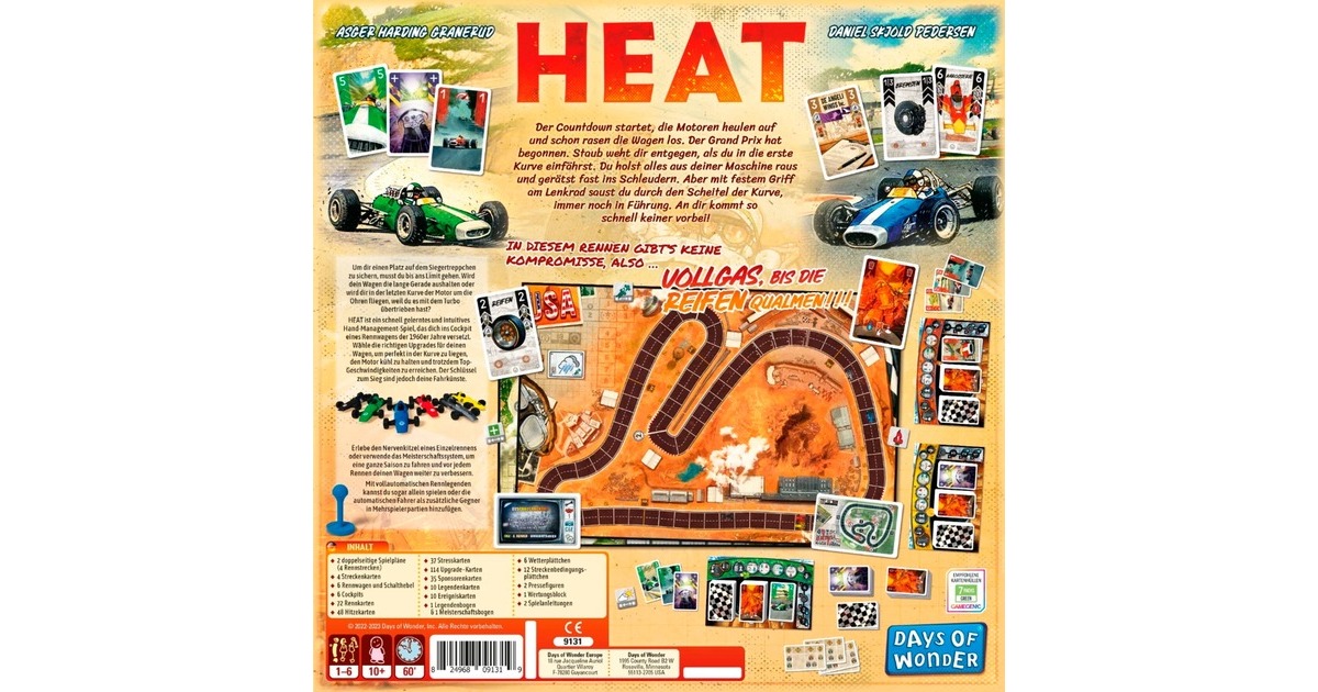 "Heat" versetzt 1-6 Spieler in ein Cockpit eines Rennwagens der 1960er-Jahre. Gespielt werden kann in Einzelrennen oder in einem Meisterschaftssystem, in dem eine ganze Saison gefahren wird. Dabei kann der Wagen durch Upgrades, die zum Beispiel eine bessere Kurvenlage oder eine effektivere Kühlung bewirken, stetig verbessert werden. Ein äußerst abwechslungsreiches Spiel für Rennsport-Fans - keine zwei Rennen werden in "Heat" gleich verlaufen!Art.-Nr.: 100045232