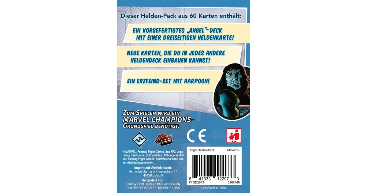 Angel war ein Mitglied der X-Men, bis ihn der böse Apocalypse in Archangel verwandelte - den Engel des Todes. Angel schaffte es, sich dem Einfluss von Apocalypse zu entziehen, doch er kämpft noch immer damit, die mächtige, aber brutale Archangel-Persönlichkeit in sich zu kontrollieren. Dieses Helden-Pack enthält alle Materialien, um "Marvel Champions: Das Kartenspiel" als Angel zu spielen, inklusive 15 heldenspezifischer Karten und eines kompletten Sortiments an Schutzkarten. Mit dabei ist außerdem ein Erzfeind-Set mit Harpoon.Art.-Nr.: 100045259