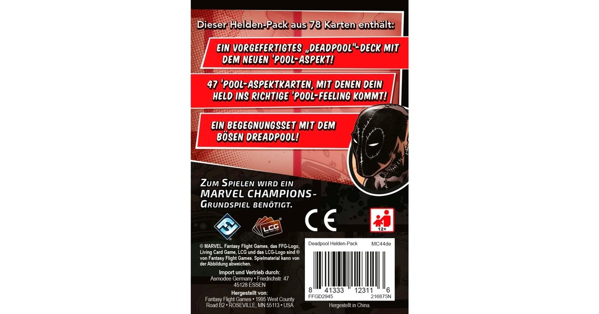 Deadpool ist ein so cooler Teil des Marvel-Universums, dass er (im wahrsten Sinne des Wortes) nach einem Aspekt verlangte, der von seiner Großartigkeit inspiriert ist. Und so wurde der "Pool-Aspekt" geboren. Deadpool kommt in einem extra großen Helden-Pack mit 78 Karten, darunter Deadpool, seine 15 heldenspezifischen Karten und eine Reihe von Karten mit dem Pool-Aspelt. Ein vorgefertigtes Deck, mit dem sofort losgespielt werden kann. Art.-Nr.: 100045263