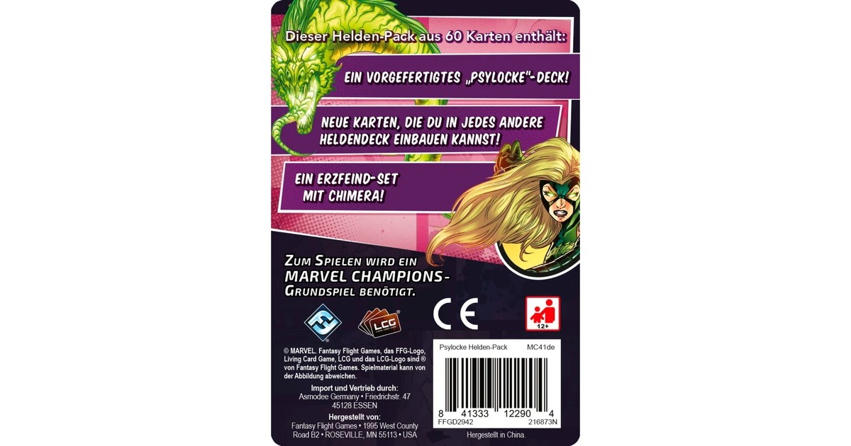Psylocke ist eine mächtige Telepathin und erfahrene Kampfkünstlerin. Mit ihren Psi-Messern durchschneidet sie die Gedanken ihrer Feinde ebenso mühelos wie ihre Psi-Katanas deren Rüstungen. Während ihres Trainings bei den X-Men entwickelte Psylocke eine starke Bindung zu ihren Mitmutanten und riskiert nun als Mitglied der X-Force ihr Leben, um sie zu schützen. Dieses Helden-Pack enthält insgesamt 60 Karten - und damit alles, was es braucht, um Psylocke in "Marvel Champions: Das Kartenspiel" zu spielen. Mit dabei sind 17 heldenspezifische Karten und ein Erzfeind-Set mit Chimera.Art.-Nr.: 100045272