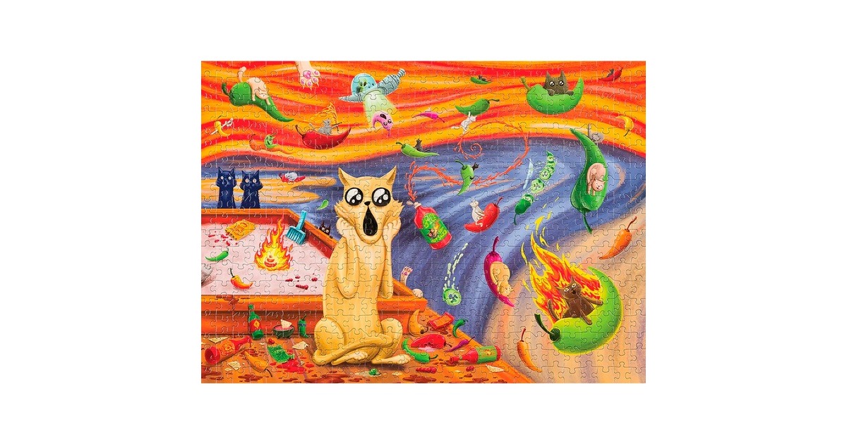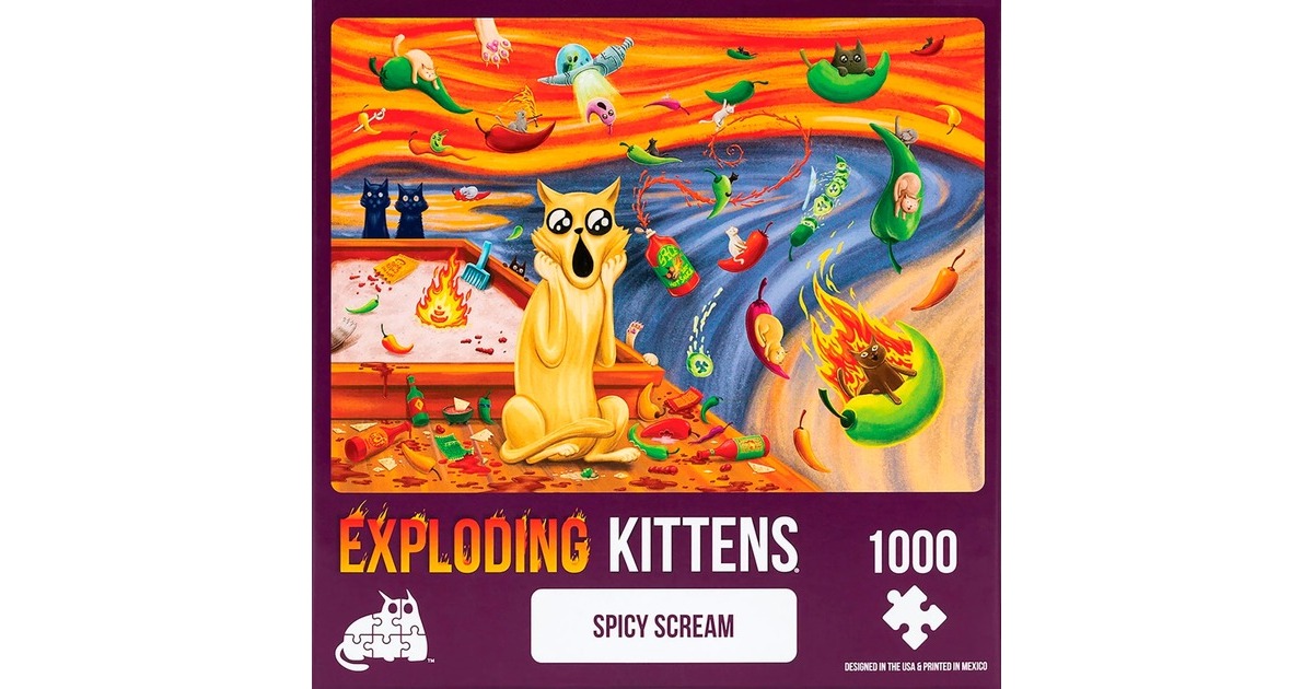 Die Puzzles aus der Welt der Exploding Kittens bieten herrlich verrückte Motive und großen Puzzlespaß. Die Motive sind katzenhafte Interpretationen besonderer Werke der Kunstgeschichte oder Charaktere aus dem Universum von Exploding Kittens. Die Puzzleteile bestehen zu 100% aus recyceltem Material. Das Puzzle Spicy Scream zeigt ein Alptraum-Katzenklo, das selbst Edvard Munch beunruhigen würde: Das passiert, wenn man zuviel scharfe Soße zu sich nimmt!Art.-Nr.: 1901685