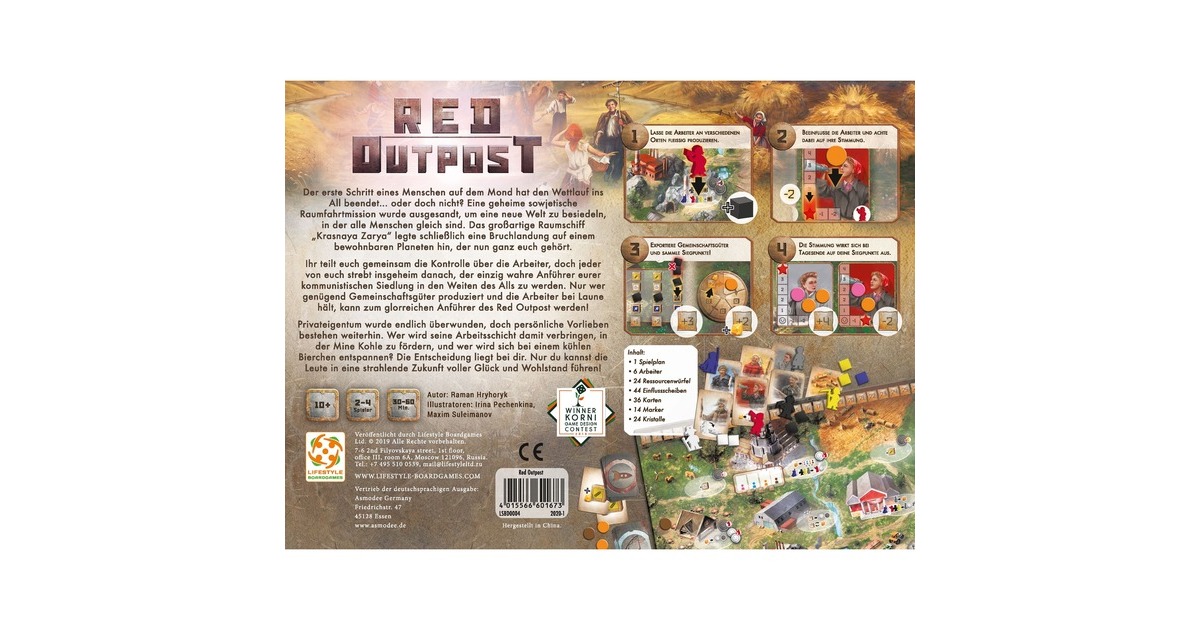 Red Outpost ist ein Arbeitereinsetz-Spiel der etwas anderen Art, in dem die Spieler auf einem fremden Planeten zusammen ein sowjetisches Paradies aufbauen. Dabei teilen sie sich ganz brüderlich die Kontrolle über die Arbeiter, produzieren fleißig Gemeinschaftsgüter und stoßen auf den Kommunismus an. Doch am Ende des Tages kann nur einer der Anführer des glorreichen – und ganz und gar nicht kooperativen – Red Outpost werden!Art.-Nr.: 1683299