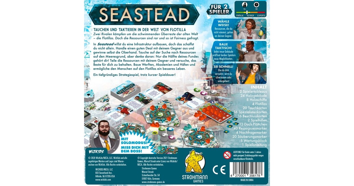 In "Seastead", einem tiefgründigen Taktikspiel für 1 bis 2 Spieler, erhebt sich die Welt von Flotilla aus den wellenumtosten Ruinen einer versunkenen Zivilisation. Mit einer fesselnden Mischung aus Geschick und Weitsicht führt ihr eure Kolonie zum Erfolg. Mit jedem Tauchgang birgt ihr wertvolle Ressourcen aus den Tiefen, um eure schwimmende Enklave zu erweitern. Errichtet Gebäude, die die Lebensader eurer Gemeinschaft stärken, und reinigt die Wasserwege, wodurch ihr die Meere von giftigen Verschmutzungen befreit. Jede Entscheidung zählt und jede Ressource ist wertvoll in diesem kompakten Strategiespiel, dass trotz seiner kurzen Spieldauer eine hohe strategische Tiefe bietet. Tausch und Kooperation sind der Schlüssel zu Erweiterung und Wohlstand. Mit scharfer Planung und einem Auge für das große Ganze könnt ihr euch zum besten Seasteader erheben.Art.-Nr.: 100045728