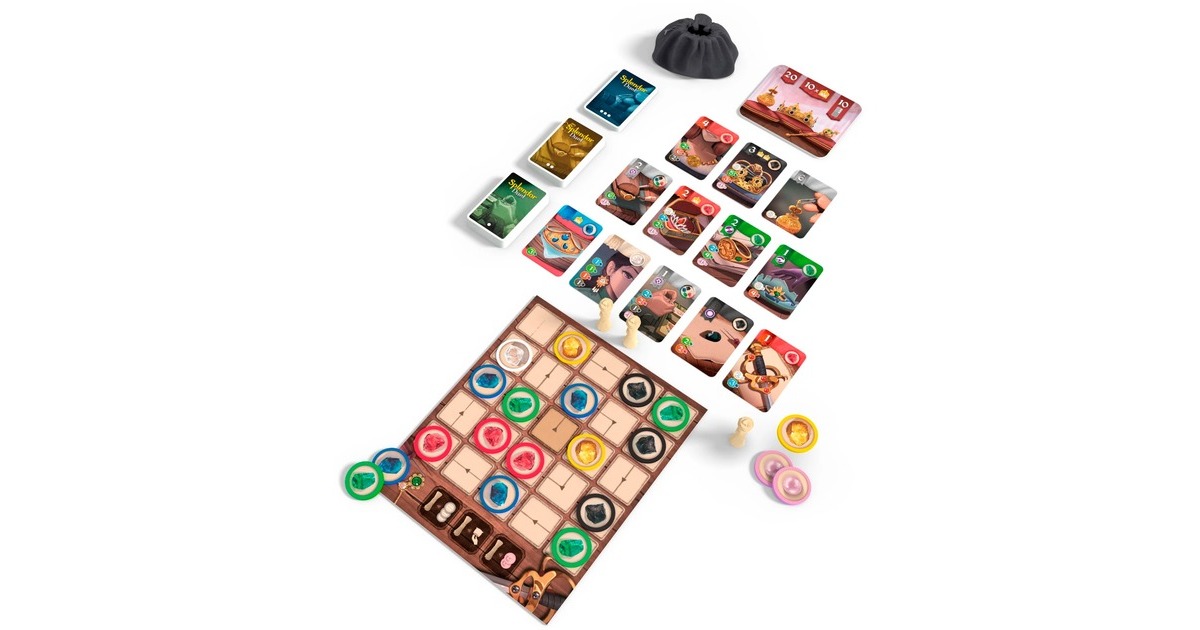 1 Siegplättchen, 67 Juwelenkarten, 1 Beutel, 3 Privilegien (Schriftrollen), 25 Chips, Spielplan, 4 Königliche Karten |