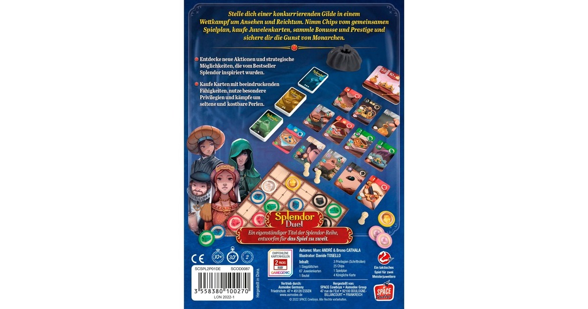 Splendor Duel ist die Zwei-Spieler-Variante von Splendor. Und wie in der größeren Vorlage geht es um Juwelen, Schmuckstücke, Prestige und Reichtum: Die Spieler erstellen als Oberhaupt einer Juweliersgilde Schmuck für Monarchen und andere einflussreiche Persönlichkeiten der Renaissance. Sieger des Spiels ist schließlich, wer am Ende die meisten Prestigepunkte und Kronen sammelt und eine der drei Siegbedingungen erfüllt.Art.-Nr.: 1902425