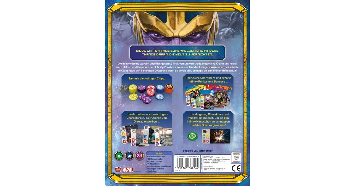 39 Infinity-Stein-Chips, 90 Charakterkarten, 5 S.H.I.E.L.D.-Chips, 4 Ortsplättchen, 1 Infinity-Handschuh-Plättchen, 1 Avengers-Plättchen, 1 Anleitung |
