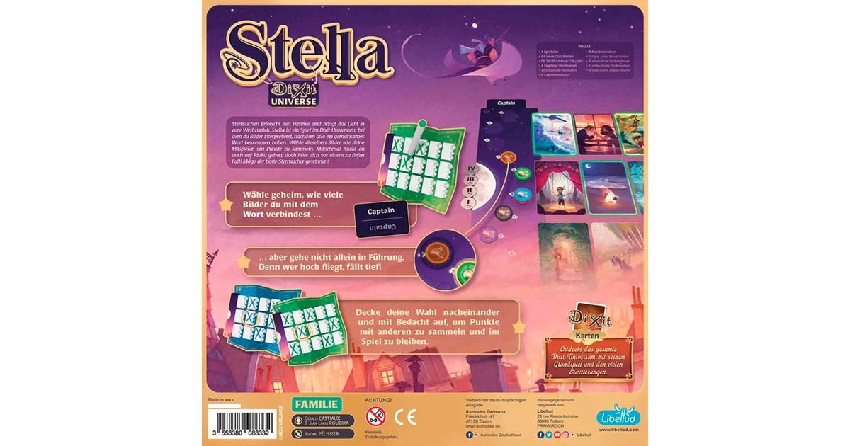 Stella ist eine neue Variante des Dixit-Universums: Die Spieler wählen eine Wortkarte, und jeder assoziiert dieses Wort heimlich mit den Dixit-Karten auf dem Tisch. Die Spieler verraten gleichzeitig die Anzahl ihrer Assoziation. Je mehr Assoziationen, desto mehr Punkte erhält der Spieler, wenn man aber als einziger die meisten Assoziationen hat, gibt es Strafpunkte. Versuch nach den Sternen zu greifen!Art.-Nr.: 1727917