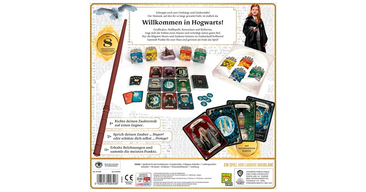 Spielbrett, 8 Zauberstäbe, 9 Wappen-Aufsteller, 1 Lieblingsschüler-Aufsteller, 142 Karten, 24 Marker, 10 Kunststoffständer, Anleitung |