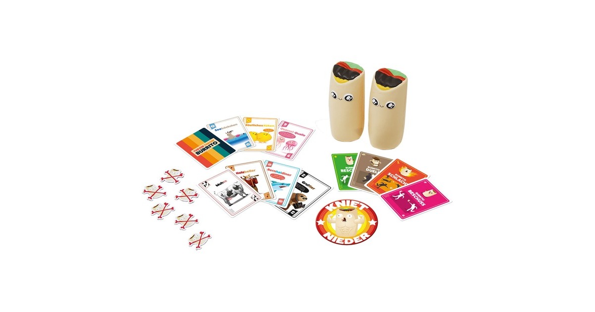 120 Spielkarten, 2 Burritos, 6 Burrito-Beulen, 1 Kniet-Nieder-Orden |