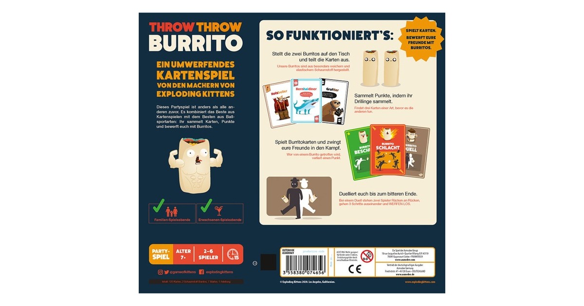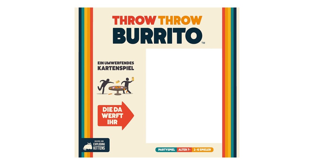 Throw Throw Burrito ist ein mitreißendes Party- und Kartenspiel von den Machern von Exploding Kittens. Es kombiniert das Beste aus Kartenspielen mit dem Besten aus Ballsportarten: Es werden Karten gesammelt, Punkte gewonnen und Burritos geworfen. Dabei wird in zwei Runden gespielt - Punkte gibt es für Karten-Drillinge, aber manche lösen auch Burrito-Kämpfe aus. Wer die meisten Punkte hat, gewinnt den den Kniet-Nieder-Orden. Zwei gewonnene Runden sind gleichbedeutend mit dem Gesamtsieg.Art.-Nr.: 1863015