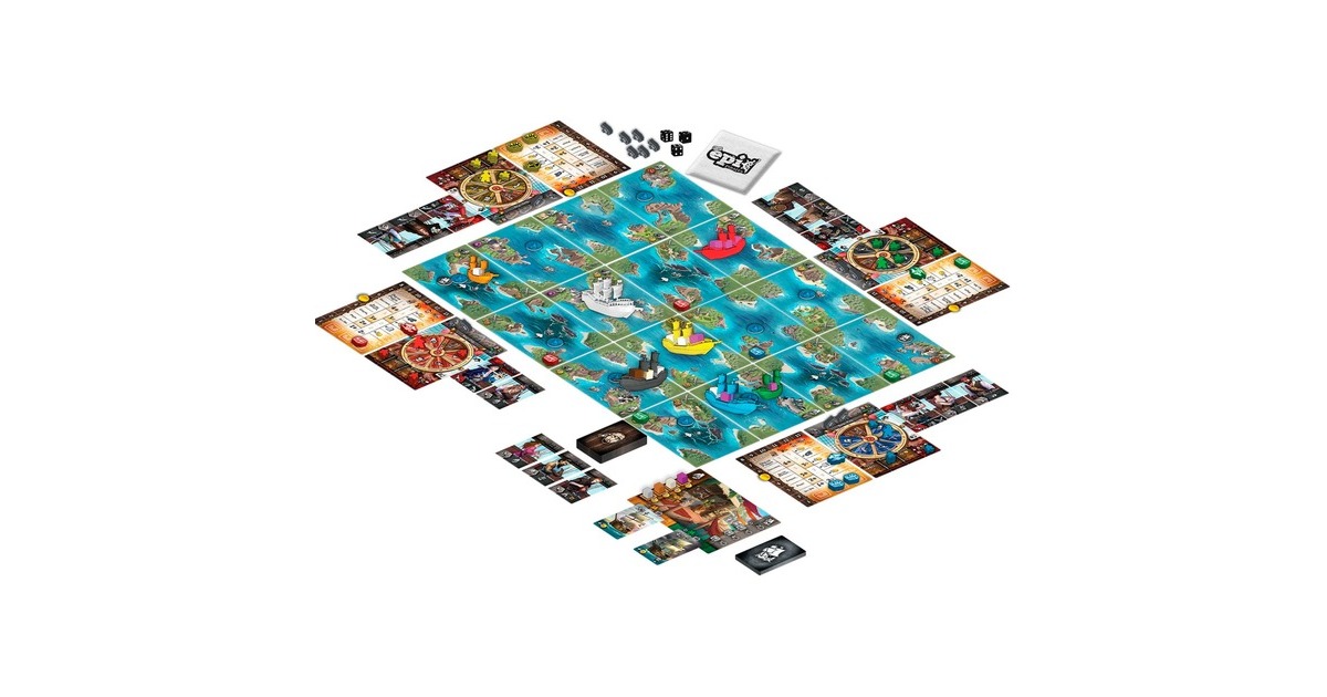 7 Schiffsfiguren, 88 Holzkomponenten, 4 Metalldublonen, 1 Stoffbeute, 3 Würfel, 42 Plättchen, 4 Steuertableaus, 4 Ruftableaus, 16 Meereskarten, 1 Markttableau, 28 Crew- und Captainkarten, 11 Handelsschiffkarten, Anleitung |