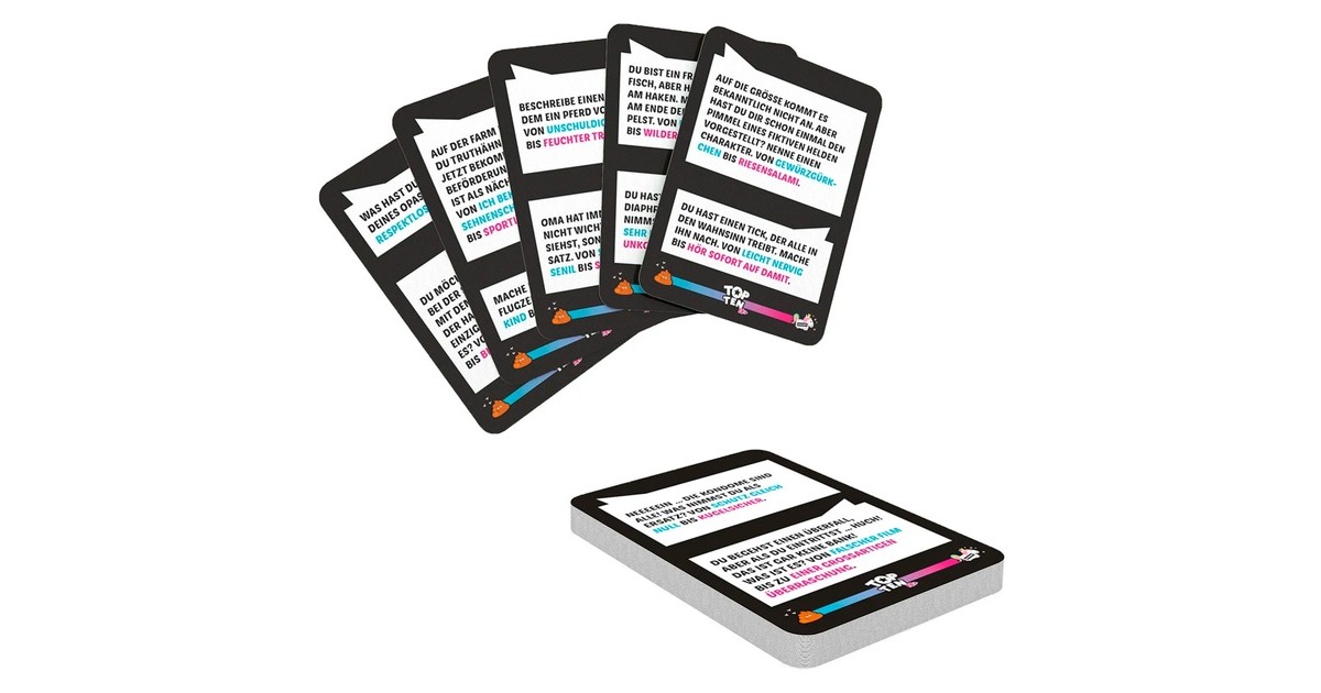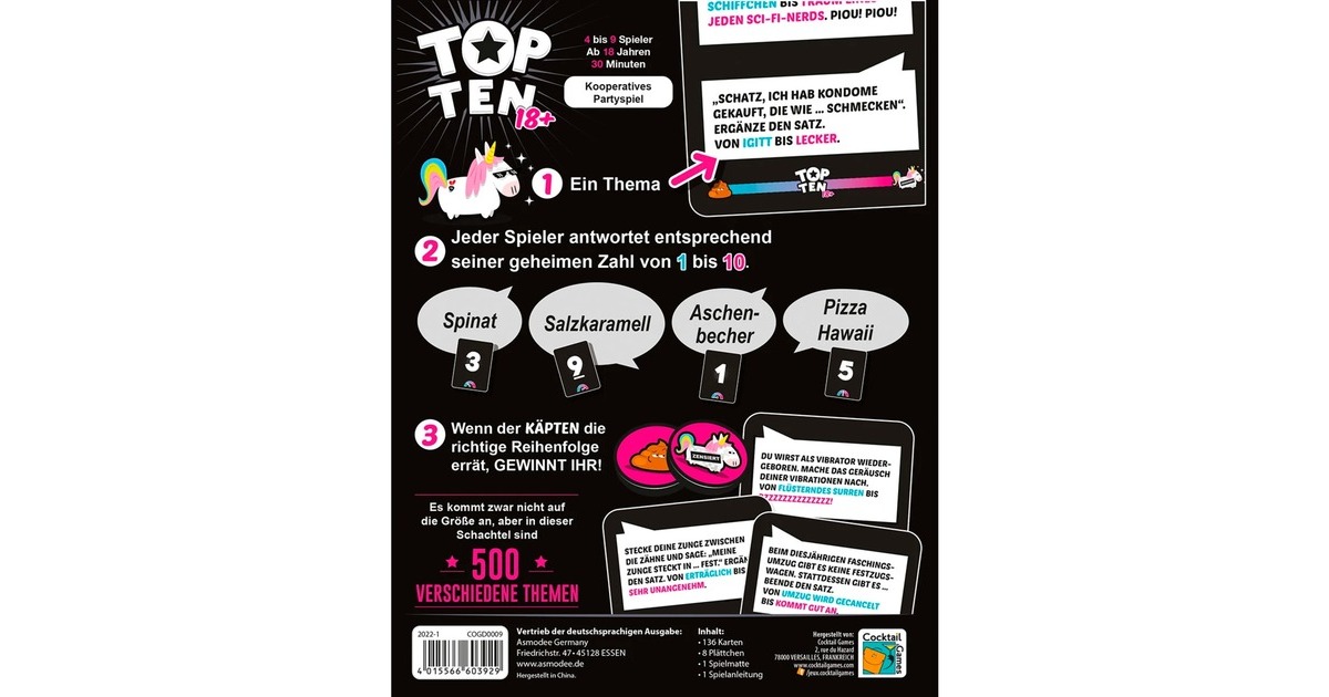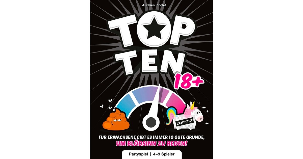 Top Ten 18+ ist ein kooperatives Spiel für Erwachsene, bei dem alle im selben Team sind. In diesem schnellen Partyspiel müssen Antworten zu einem Thema gefunden werden und ein Kapitän muss die Reihenfolge erraten. Dazu deckt er eine Themenkarte auf und das Team erhält eine Aufgabe. Nun erhält der Kapitän vom Team Antworten, die er in die richtige Reihenfolge bringen muss. Bei jeder falschen Reihenfolge wandert ein Marker vom Einhorn-Stapel auf den Kackhaufen, der natürlich nicht zu groß werden sollte. Top Ten ist ein Spiel, das so manchen gemeinsamen Lacher erzeugen wird. Die 18+-Version enthält eine Sammlung manchmal nicht ganz jugendfreier Fragen. Art.-Nr.: 1902449