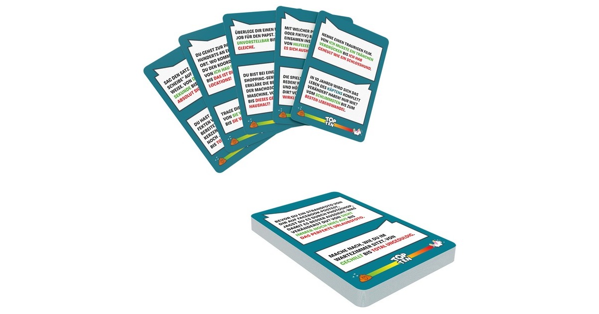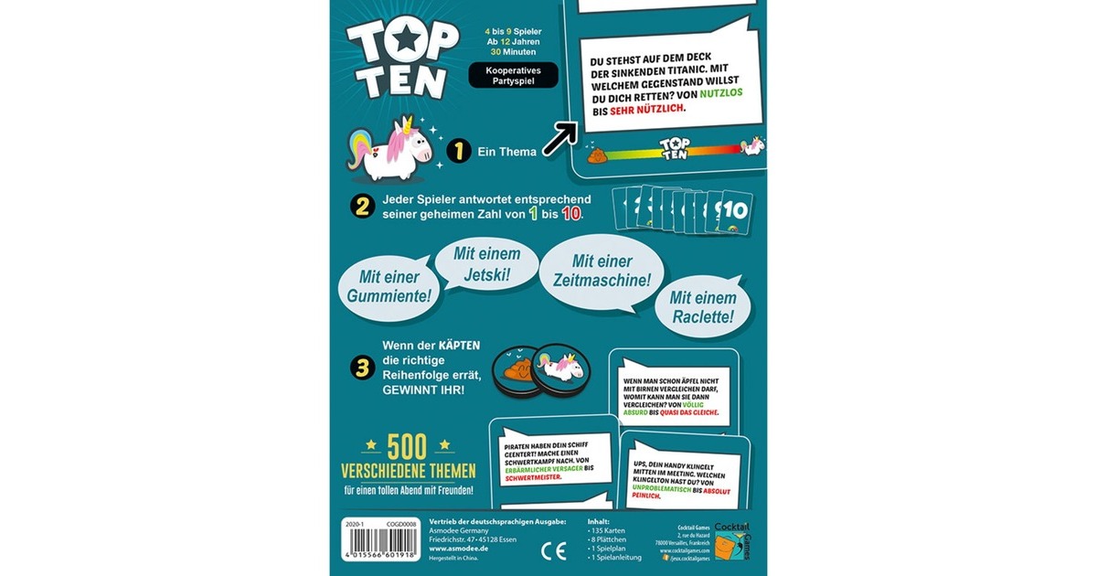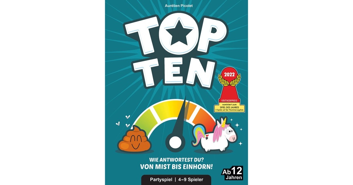 Top Ten ist ein kooperatives Spiel, in dem alle im selben Team sind. In diesem schnellen Partyspiel müssen Antworten zu einem Thema gefunden werden und ein Kapitän muss die Reihenfolge erraten. Dazu deckt er eine Themenkarte auf und das Team erhält eine Aufgabe. Nun erhält der Kapitän vom Team Antworten, die er in die richtige Reihenfolge bringen muss. Bei jeder falschen Reihenfolge wandert ein Marker vom Einhorn-Stapel auf den Kackhaufen, der natürlich nicht zu groß werden sollte. Top Ten ist ein Spiel, das so manchen gemeinsamen Lacher erzeugen wird.Art.-Nr.: 1855019