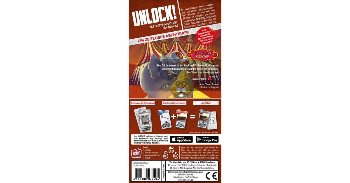 Unlock! - Die Noside Show bringt die Action in den Zirkus. Der Zirkus Diosen kommt in die Stadt und Professor Noside plant einen finsteren Sabotageakt! Ihr müsst ihn aufhalten. Die Show muss weitergehen! In Live-Escape-Rooms werden die Teilnehmer eingeschlossen und müssen es innerhalb von 60 Minuten schaffen, den Raum zu verlassen. Unlock! lässt euch dieses kooperative Erlebnis am heimischen Spieltisch erleben.Art.-Nr.: 1683052