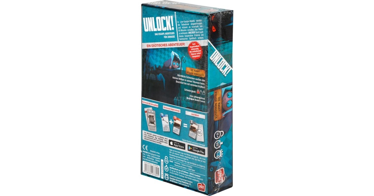 Unlock! – Die Nacht voller Schrecken ist ein Einzelszenario der Unlock! Reihe.In den von einer App unterstützten Rätsel- und Escape-Spielen kombiniert ihr gemeinsam Karten und löst Rätsel. In Die Nacht voller Schrecken müssen die Spieler mit vereinten Kräften den kleinen William vor Traumschrecken beschützen.Art.-Nr.: 1617294