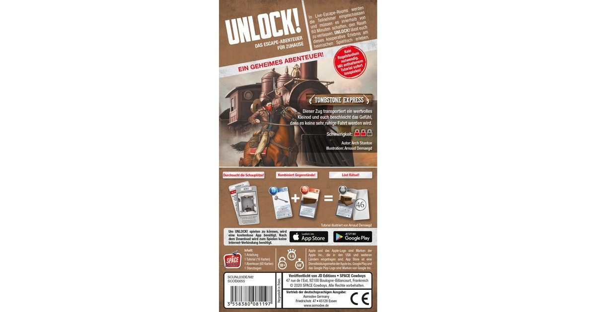 Dieser Zug transportiert ein wertvolles Kleinod und euch beschleicht das Gefühl, dass es keine sehr ruhige Fahrt werden wird. In Unlock! – Tombstone Express erwartet euch eine wilde Zugfahrt durch den Wilden Westen, voller Abenteuer, einem spannenden Kriminalfall und überraschender Ereignisse. Die Spiele der Unlock!-Reihe lassen euch das kooperative Erlebnis eines Escape-Room-Besuchs am heimischen Spieltisch erleben – und das dank der kostenfreien App in Echtzeit und mit Sound. Ein Tutorial und fünf eigenständige Demo-Szenarios zum Ausdrucken findet ihr unter Bonus zum Download!Art.-Nr.: 1683074