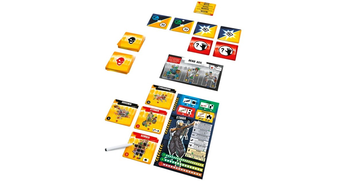 Anleitung, 37 Karten, 72 abwischbare Zombiekarten, 6 abwischbare Überlebendentableaus, 6 abwischbare Bosstableaus, 6 Stifte |