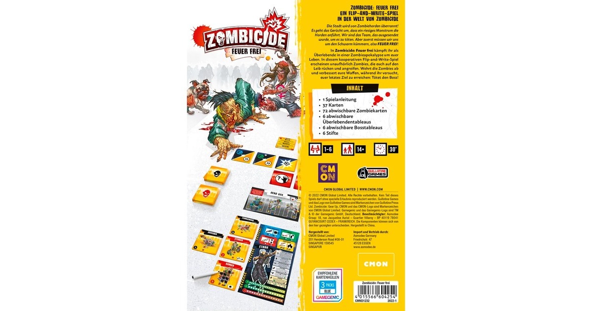 Zombicide: Feuer Frei! ist ein kooperatives Flip-and-Write-Spiel aus dem Zombicide-Universum. 1-6 Überlebende müssen während einer Zombie Apokalypse um ihr Leben kämpfen. Sie sind Elitekämpfer, die auf den Straßen bewähren müssen. Um das Spiel zu gewinnen, muss das Team den Zombie-Boss erledigen.Art.-Nr.: 1902452