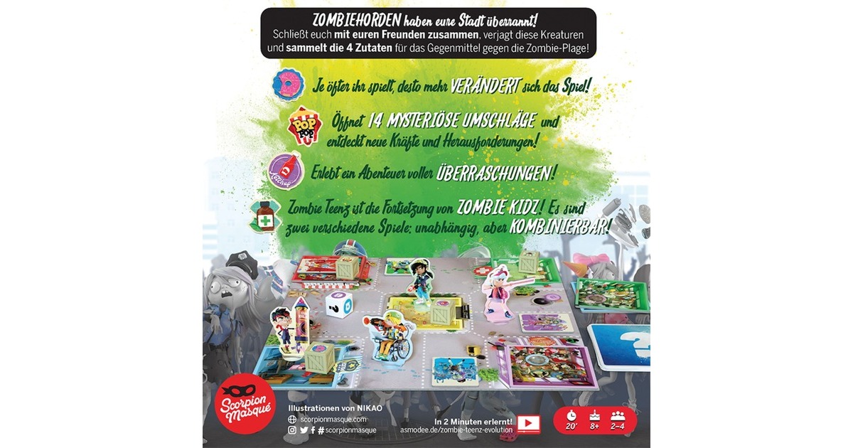 Zombie Teenz Evolution ist die Fortsetzung des Legacy-Spiels für Kinder Zombie Kidz Evolution! Es handelt sich hierbei um zwei unabhängige Spiele, die aber miteinander kompatibel sind. Arbeitet in diesem Spiel zusammen, jagt die Zombies aus der Stadt und findet ein Heilmittel! Dieses evolutionäre Spiel enthält viele neue Umschläge mit spannenden Überraschungen bereit.Art.-Nr.: 1727299