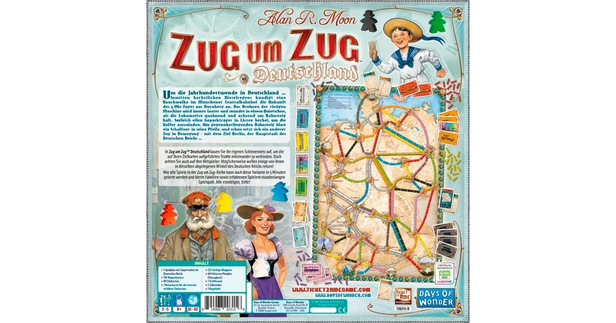 In "Zug um Zug: Deutschland" bauen die Spieler ihr eigenes Schienennetz auf, um die auf ihren Zielkarten angegebenen Städte miteinander zu verbinden. Doch gilt es, seine Mitspieler im Auge zu behalten: Denn auch diese könnten in dieselben Städte reisen wollen. Kurze und lange Strecken sowie Bonuspunkte für die meisten erfüllten Zielkarten sorgen für abwechslungsreiche Partien. Diese Neuauflage aus 2023 enthält bereits die Erweiterung "Deutschland 1902" und bringt mit zusätzlichen Zielkarten und Passagieren noch mehr Abwechslung ins Spiel.Art.-Nr.: 1902065