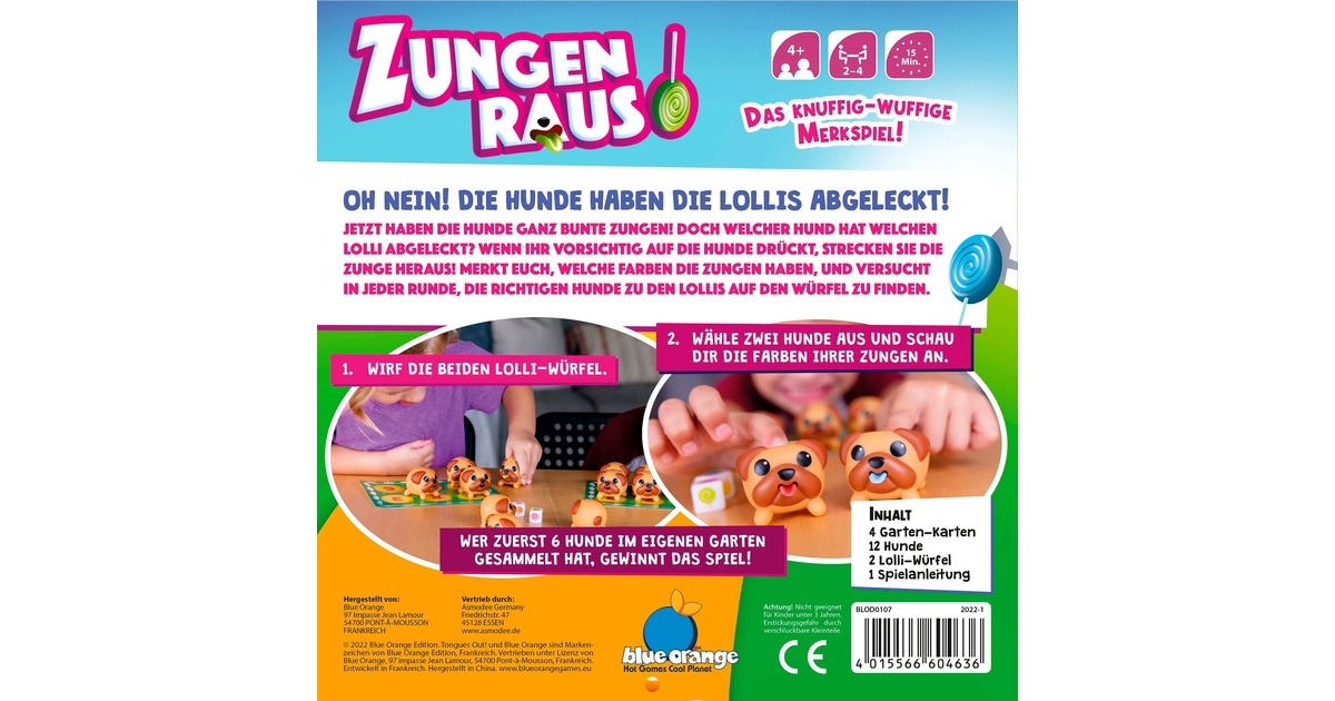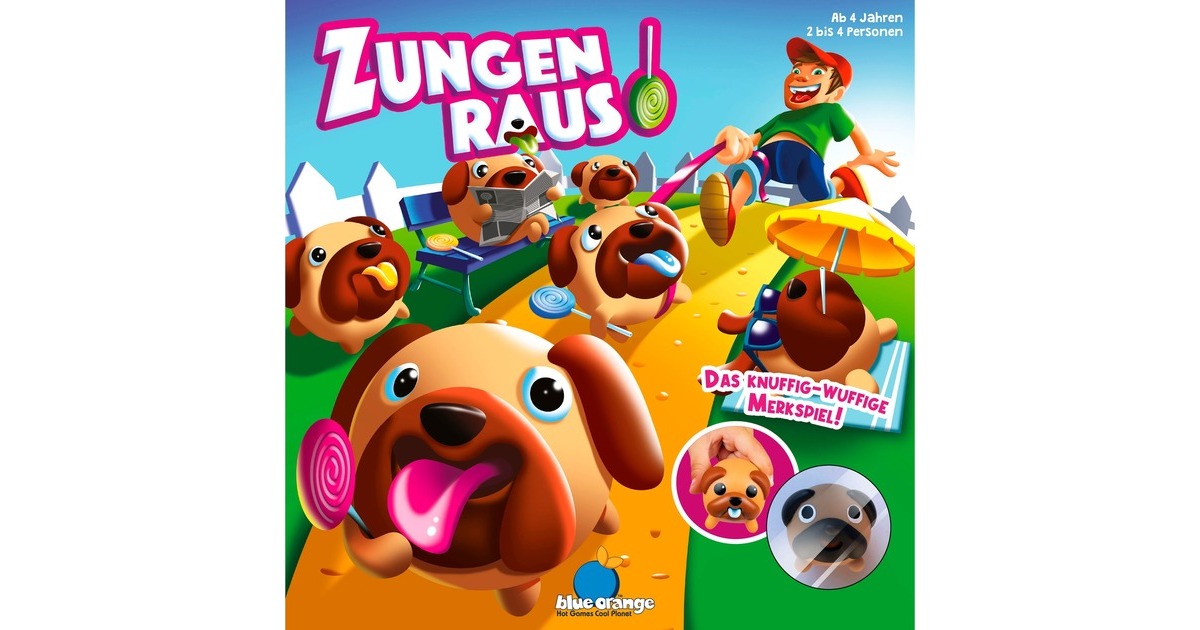 Die Hunde waren schon wieder an den Lollis und haben jetzt ganz bunte Zungen! Nun gilt es, herauszufinden, wer welchen Lolli abgeleckt: Einfach auf den Hund drücken, so dass er die Zunge rausstreckt. Dann gut merken, welche Farbe die Zungen hat und dann den richtigen Hund zum Lolli auf dem Würfel finden! Das lustige Memory-Spiel Zungen raus! überzeugt mit niedlichen Hundefiguren und toller Haptik schon Kinder ab vier Jahren. Art.-Nr.: 1902459