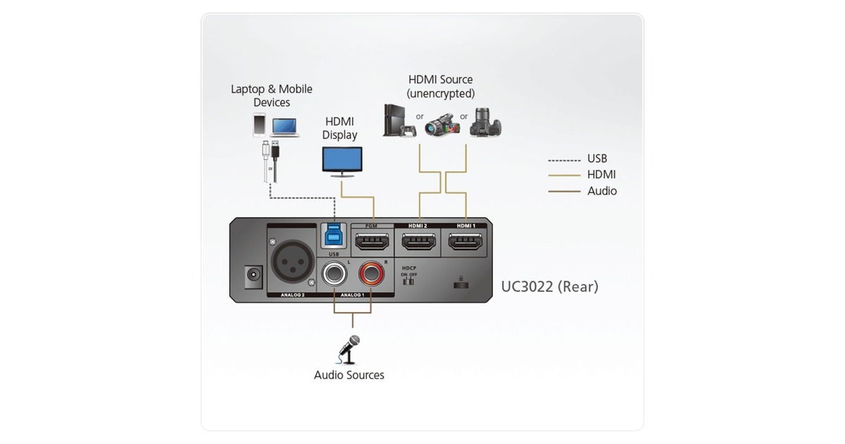 Videoeingang: 2160p30/25/24, 1080p60/50/30/25/24, 720p60/50, HDMI 1.4b Unterstützung | PGM Videoausgang: 1080p60/50/30/25/24, 720p60/50, HDMI 1.4b Unterstützung (unverschlüsselt) (Unterstützt verschlüsselte PGM Ausgabe bei 2160p30/25/24, 1080p60/50/30/25/24, 720p60/50 mit deaktivierter UVC Erfassung) | 16-Bit PCM Audio, 44,1 KHz und 48 KHz |