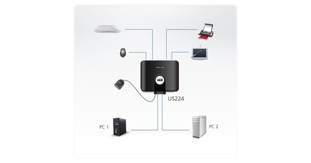 Das ATEN US224 ist ein System mit 2 Ports, über das 2 Computer gemeinsamen Zugriff auf bis zu 4 USB-Geräte erhalten - eine Tastatur, eine Maus und bis zu 2 Peripheriegeräte. Zusätzliche Ausgaben für eine getrennte USB-Tastastur-, -Maus sowie -Peripheriegeräte für jeden einzelnen Computer sind überflüssig. Dank des All-in-one-Designs des US224 ist die Installation einfach und übersichtlich - es werden keine 2 getrennten USB-Kabel für die Computer benötigt und so entsteht kein Kabelsalat.Art.-Nr.: 1139722