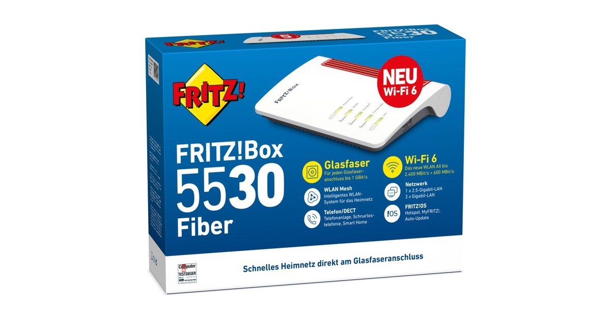 Dank des neu integrierten Internetstandards WLAN AX (Wi-Fi 6) mit MIMO und einem 2,5-Gigabit-LAN-Port ist die FRITZ!Box 5530 Fiber eine zuverlässige Zentrale für Ihr Heimnetz. Die Besonderheit des neuen WLAN-Standards: Er ist dahingehend perfektioniert, eine Vielzahl an Geräten parallel ins Heimnetz zu integrieren. So können Nutzer all ihre Geräte zu Hause jederzeit und überall problemlos nutzen. Damit Videos, Musik und Fotos im Heimnetz nahtlos bis in den letzten Winkel jedes Zimmers gelangen, setzt die FRITZ!Box 5530 Fiber auf WLAN Mesh. Die verteilten FRITZ!-Geräte arbeiten in einem einzigen Netz, tauschen sich untereinander aus und optimieren die Leistung aller WLAN-Geräte. Mit Mesh genießen Nutzer ganz einfach Höchstgeschwindigkeit bei Surfen, Video oder Gaming. Atemberaubendes HD-Fernsehen und ihre Lieblingsmusik warten jetzt auf die Nutzer – und nicht umgekehrt.Art.-Nr.: 1852808