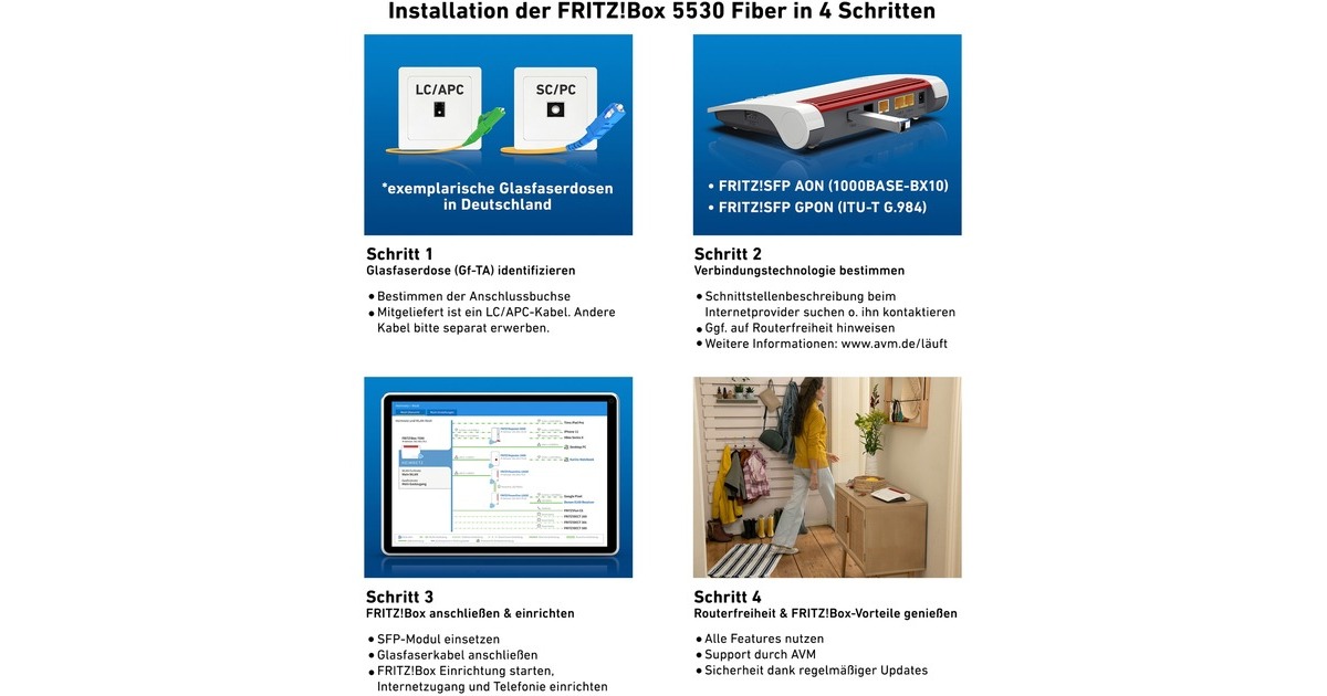 DECT Basis für bis zu 6 Geräte, Firewall/NAT, DHCP-Server, DynDNS-Client, UPnP AV, Für den Anschluss an GPON (Gigabit Passive Optical Network) und AON (Active Optical Network) geeignet, Routerbetrieb auch über eine bestehende Internetverbindung via LAN oder mit Mediakonverter am SFP-Modul, Stateful Packet Inspection Firewall mit Portfreigabe für sicheres Surfen im Internet, Sicherer Fernzugang über das Internet mit VPN (IPSec) |