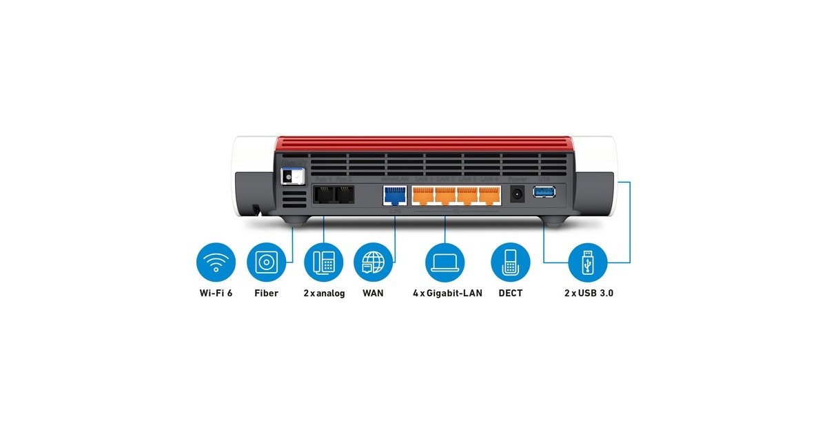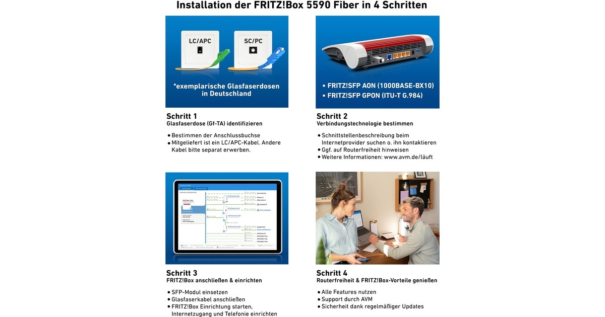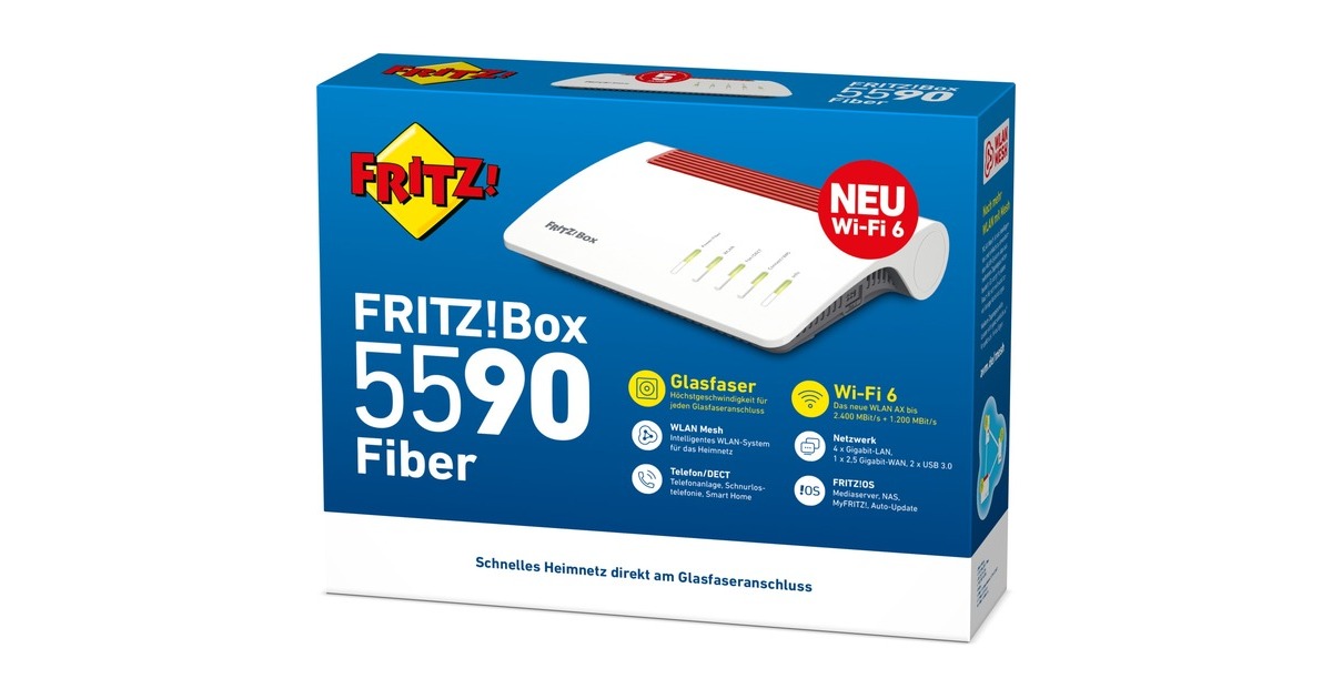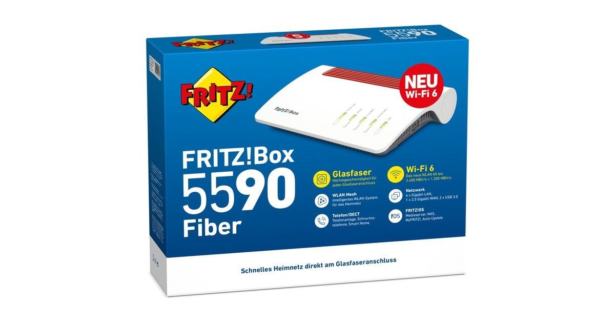 Die FRITZ!Box 5590 Fiber ist ideal geeignet für alle Glasfaseranschlüsse. Gigabit-Geschwindigkeiten direkt aus der Glasfaser für Ihr Heimnetz, ganz ohne die Zwischenstation eines Medienkonverters oder Provider-Modems: Dafür sorgen die FRITZ!SFP-Module, die für die verbreiteten Glasfaser-Technologien AON und GPON bereitstehen. Die FRITZ!Box 5590 Fiber erkennt die eingesetzte Technologie und empfiehlt das richtige FRITZ!SFP-Modul. Die leistungsstarke Hardware der FRITZ!Box 5590 Fiber bringt die Höchstgeschwindigkeit ins Heimnetz – neben unglaublich schnellem Wi-Fi 6 stehen auch vier Gigabit-LAN-Anschlüsse bereit – der 2,5-Gigabit-WAN-Port lässt sich auf Wunsch als 2,5-Gigabit-LAN-Anschluss verwenden. An den zwei USB-3.0-Schnittstellen können Sie Festplatten für den Netzwerkspeicher FRITZ!NAS anschließen oder Drucker im Netzwerk freigeben.Art.-Nr.: 1852812