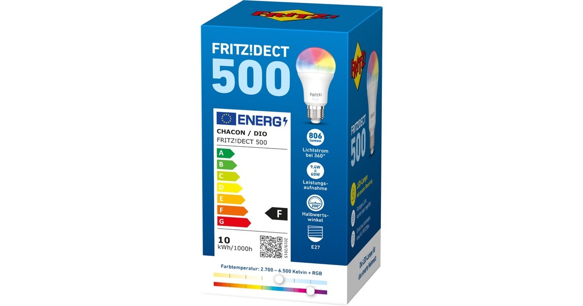 Mit der FRITZ!DECT 500 kommt farbiges Licht ins eigene Zuhause. Diese smarte LED-Lampe für den Sockel E27 lässt sich ganz einfach in das FRITZ!-Heimnetz einbinden. Damit stehen vielfältige Steuerungsmöglichkeiten zur Verfügung: per App auf dem Smartphone oder auf anderen mobilen Endgeräten. Neben Farbtemperatur und Helligkeit lässt sich die Beleuchtungsfarbe anpassen - ganz nach Wunsch, zeitgesteuert und immer der Situation angepasst.Art.-Nr.: 1660326