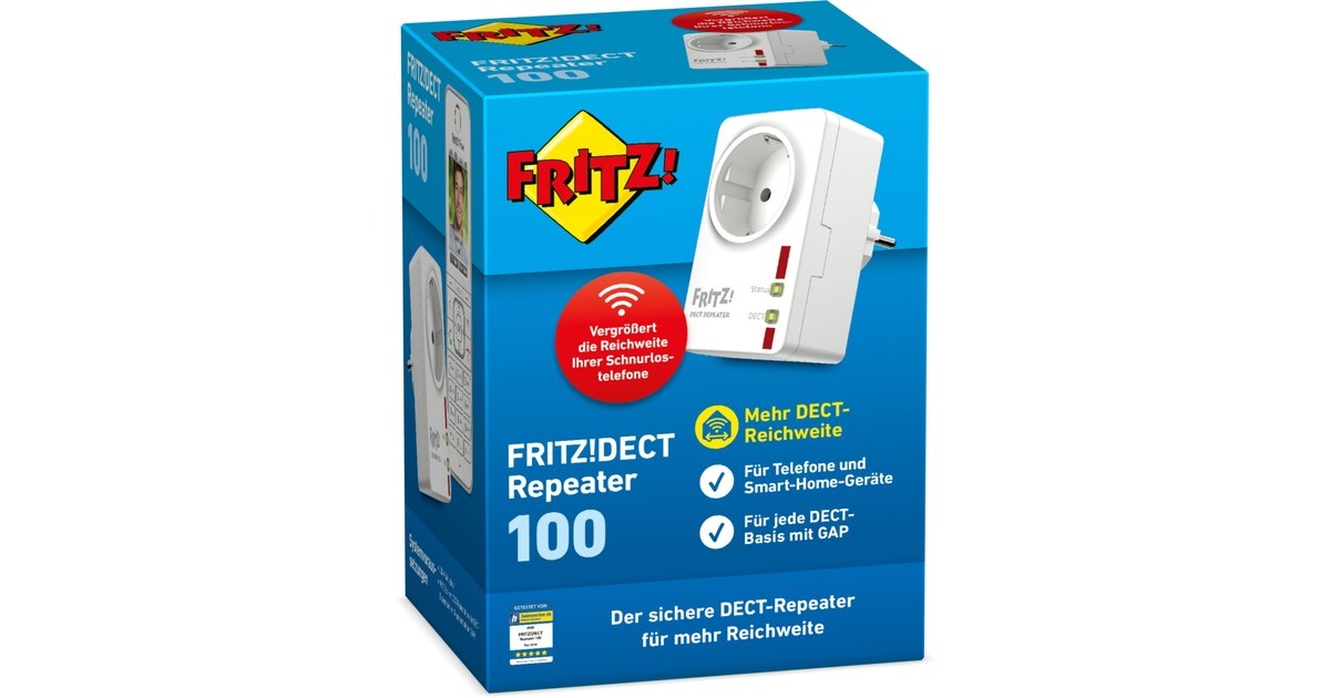 Der FRITZ!DECT Repeater 100 vergrößert sicher die DECT-Reichweite. Er ist ideal geeignet für alle FRITZ!Box-Modelle mit integrierter DECT-Basisstation. Damit wird schnurlose Telefonie auch in HD-Qualität über größere Entfernungen realisierbar. Der FRITZ!DECT Repeater 100 ist herstellerübergreifend einsetzbar - er vergrößert die Reichweite jeder DECT-Basisstation mit Repeater-Funktion (GAP). In Kombination mit einer FRITZ!Box mit integrierter DECT-Basis (z.B der FRITZ!Box 7390) und einem modernen DECT-Handgerät, wie dem FRITZ!Fon, lassen sich schnurlose Telefonate in kristallklarer HD-Qualität auch über größere Distanzen kinderleicht realisieren. Eine voreingestellte DECT-Verschlüsselung sorgt für sorgenfreie, abhörsichere Telefongespräche. Es können bis zu drei Gespräche gleichzeitig geführt werden. Insgesamt können Sie bis zu sechs Handgeräte sowie sechs DECT-Repeater an der DECT-Basis der FRITZ!Box anmelden und nutzen.Art.-Nr.: 1051777