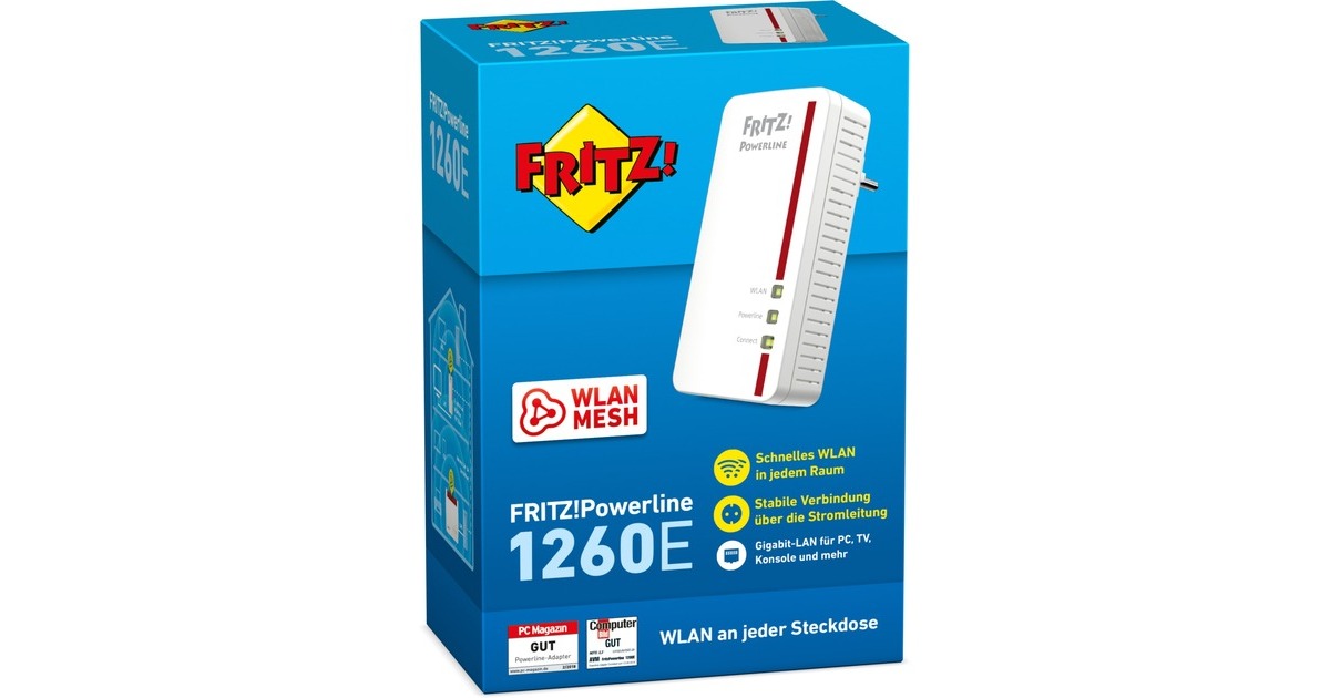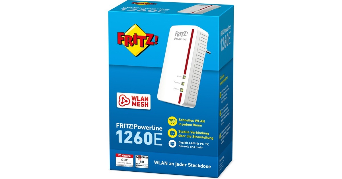 Der FRITZ!Powerline 1260E Adapter macht aus jeder Steckdose einen schnellen und sicheren Gigabit-Netzwerkanschluss. Mit Gigabit-Powerline von bis zu 1.200 MBit/s und neuester 2x2 MIMO-Technologie werden deutlich robustere Verbindungen, größere Reichweiten und höhere Datendurchsätze erzielt. Zusätzlich stellt das Gerät einen WLAN AC+N-Access-Point mit bis zu 1266 MBit/s zur kabellosen Anbindung von Smartphone, Tablet und Notebook ans Heimnetz. So ermöglicht FRITZ!Powerline 1260E Breitband-Anwendungen mit höchsten Ansprüchen auch im letzten Winkel von Haus und Wohnung.Art.-Nr.: 1379790