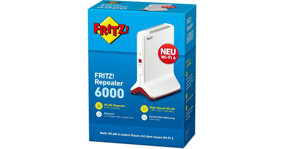 Mit drei Funkeinheiten, die in Summe einen Datendurchsatz von bis zu 6.000 MBit/s erzielen können, stellt der Repeater eine stabile Verbindung und ein Maximum an Bandbreite für alle verbundenen WLAN-Geräte zur Verfügung. Gleichzeitig erhöht der FRITZ!Repeater 6000 die Reichweite im WLAN und sorgt für eine perfekte Funkabdeckung bis in den letzten Winkel von Haus und Wohnung.
