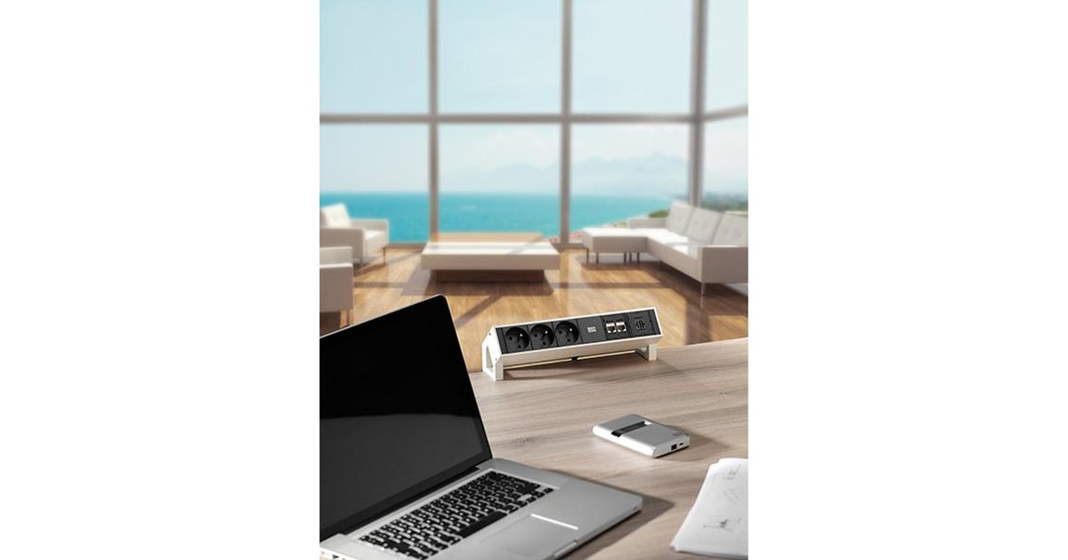 Die 3-fach Steckdosenleiste DESK 2 von Bachmann wird mit Haltewinkeln schnell und einfach an die Tischkante montiert, die Leitungen werden hinter der Sichtblende geführt. Sie wurde für die flexible Nutzung im Büro, in Besprechungsräumen, im Home-Office oder für das Desk-Sharing konzipiert. Der modulare Aufbau von DESK 2 ermöglicht die individuelle Bestückung exakt mit den Kommunikations- und Versorgungsanschlüssen, die für den jeweiligen Einsatz benötigt werden. Die Daten- und Stromanschlüsse werden in die normierten Modulfenster geschraubt und können einfach umgerüstet werden. Die Steckdosenleiste ist aus Aluminium gefertigt und in unterschiedlichen Farben erhältlich. Die Gestaltung ist schlicht und klar, die verarbeiteten Materialien sind hochwertig und langlebig.Art.-Nr.: 1176321
