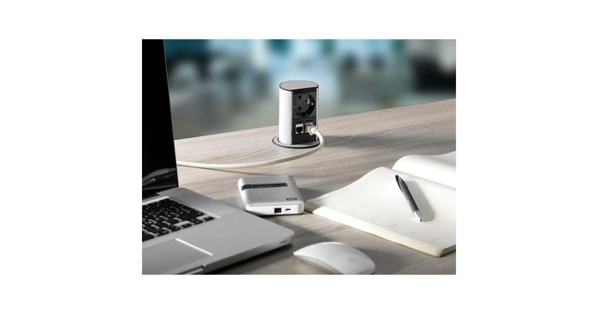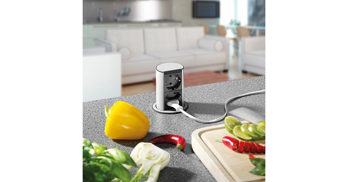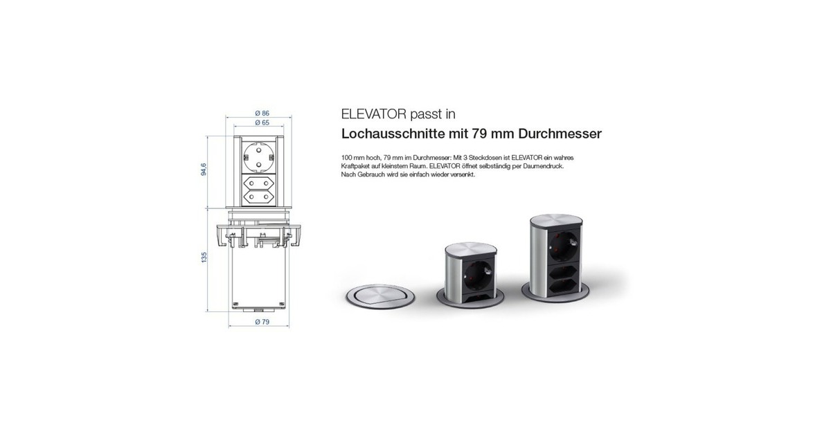 Die versenkbare Bachmann ELEVATOR 3-fach Schutzkontaktsteckdose passt sich jeder Arbeitsumgebung optimal an. Mit 114mm Durchmesser ist die ELEVATOR Steckdosenleiste ideal geeignet, wenn es darum geht Strom- und Datenanschlüsse auf kleinstem Raum zu integrieren. Per Daumendruck fährt die ELEVATOR aus und wird einfach flächenbündig bei Nichtgebrauch wieder versenkt. Die ausfahrbare Steckdose in Edelstahl-Optik eignet sich perfekt für die Montage in Büros oder Küchenarbeitsplatten, und kann problemlos auch horizontal eingebaut werden. ELEVATOR gibt es in unterschiedlichen Ausführungen: mit zwei oder drei Steckdosen, oder mit einer Steckdose und zwei Datenschlüssen. Der Einbau ist denkbar einfach. ELEVATOR wird in einen Ausschnitt von 79mm Durchmessern gesetzt und mittels Konterring von unten an der Tischplatte festgeschraubt.Art.-Nr.: 1233769