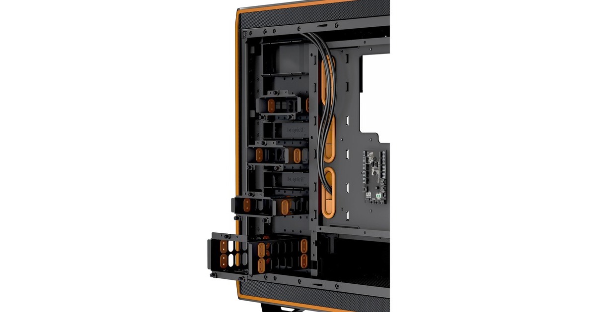 Entkoppelte Montage der Festplatte, schwarze und orange HDD-Entkopplungs-Gummis inklusive |
