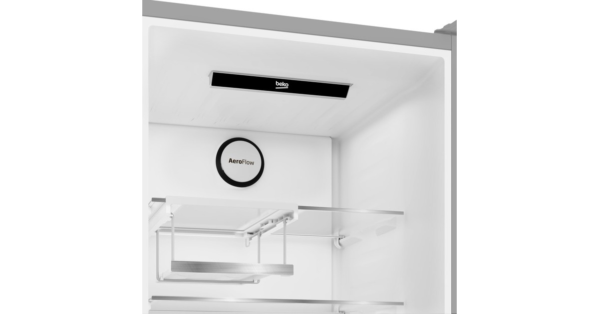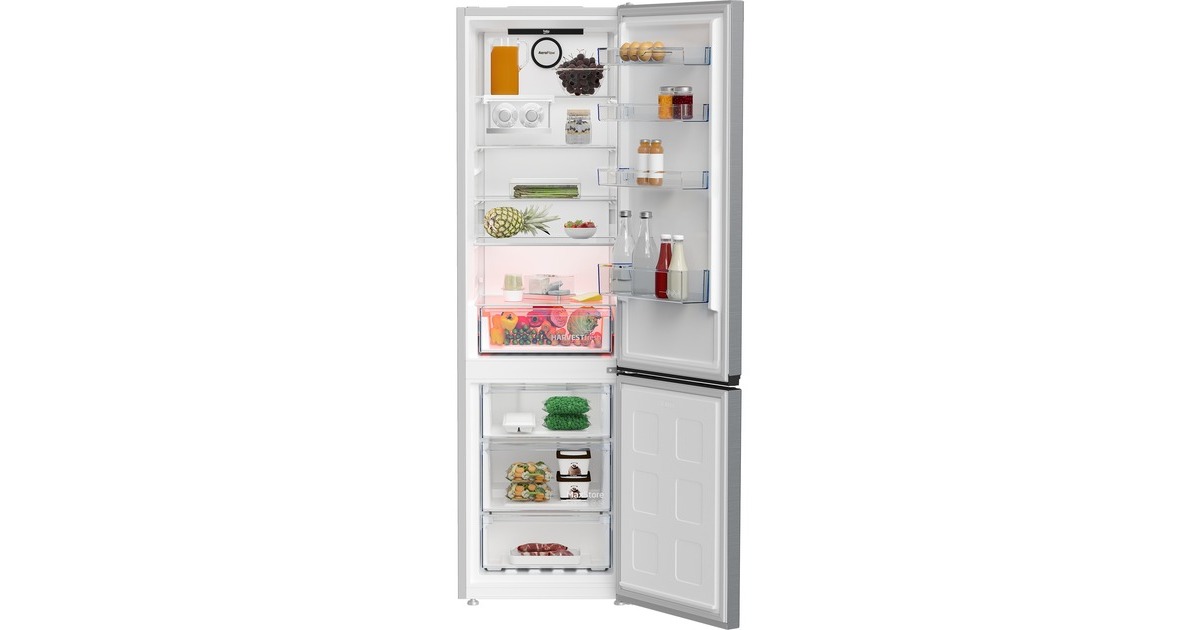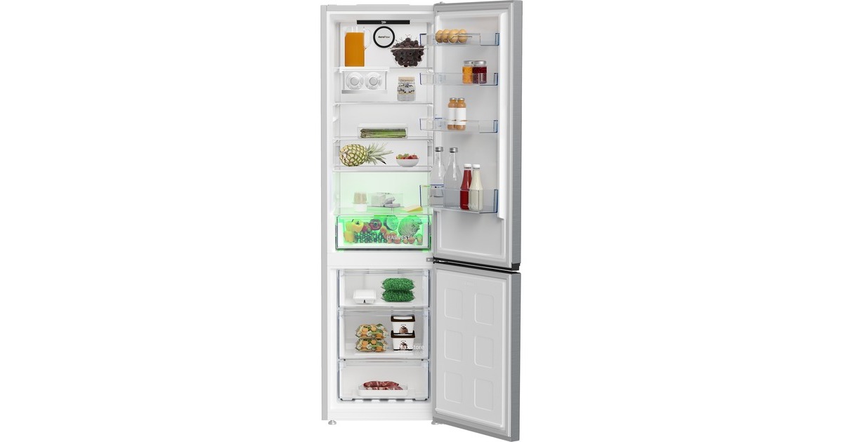 Die Kühl-/Gefrierkombination Beko B5RCNE405HXB ist mit einem Gesamtnutzinhalt von 355 Litern ideal für den mittelgroßen Haushalt geeignet und passt sich dank SmoothFit perfekt an die Küche an, da die Gerätetür an der Seite nicht übersteht. Der 249 Liter umfassende Kühlbereich ist für die übersichtliche Lagerung frischer Lebensmittel mit fünf Glasabstellflächen, davon vier höhenverstellbar, einer Obst-/Gemüseschublade mit Harvest Fresh-Technologie zur Imitation des natürlichen Sonnenzyklus sowie vier Türfächern ausgestattet. Der Gefrierbereich stellt auf einem Nutzinhalt von 106 Litern drei Gefrierschubladen zur Verfügung und muss dank NoFrost-Technologie nie wieder mühsam abgetaut werden. Die Schnellgefrieren-Funktion schützt bereits Gefrorenes beim Einlegen neuer Lebensmittel und im Urlaubsmodus spart man viel Energie, da der Kühlraum nur mit minimaler Leistung arbeitet und der Gefrierschrank weiter normal betrieben wird. Alle Funktionen lassen sich, ebenso wie die Temperatur, über das außenliegende Membran-Display steuern und kontrollieren. Mit einem Stromverbrauch von 205 kWh im Jahr ist die B5RCNE405HXB in die Energieeffizienzklasse E eingestuft.Art.-Nr.: 100022415