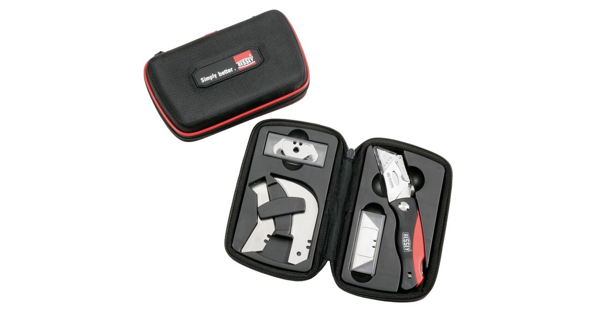 Das Klingen-Klappmesser DBKPH-SET von Bessey verfügt über einen Hebel zur festen Arretierung der Klinge. Der Mechanismus erlaubt einen schnellen und einfachen Klingentausch. Die 5 Ersatzklingen sind im Klingenfach mit Verschlusssicherung gut aufgehoben und immer schnell zur Hand. Über das weiche Daumenkissen aus Kunststoff kann man leicht mit maximalem Anpressdruck arbeiten. Ein kurzer Druck auf den Lösehebel aus Metall genügt, und die Feststellklinge lässt sich schnell einklappen. Im praktischen Nylonetui mit Reißverschluss sind außerdem weitere 4 verschiedene Klingen für unterschiedliche Werkstoffe enthalten.Art.-Nr.: 1589794