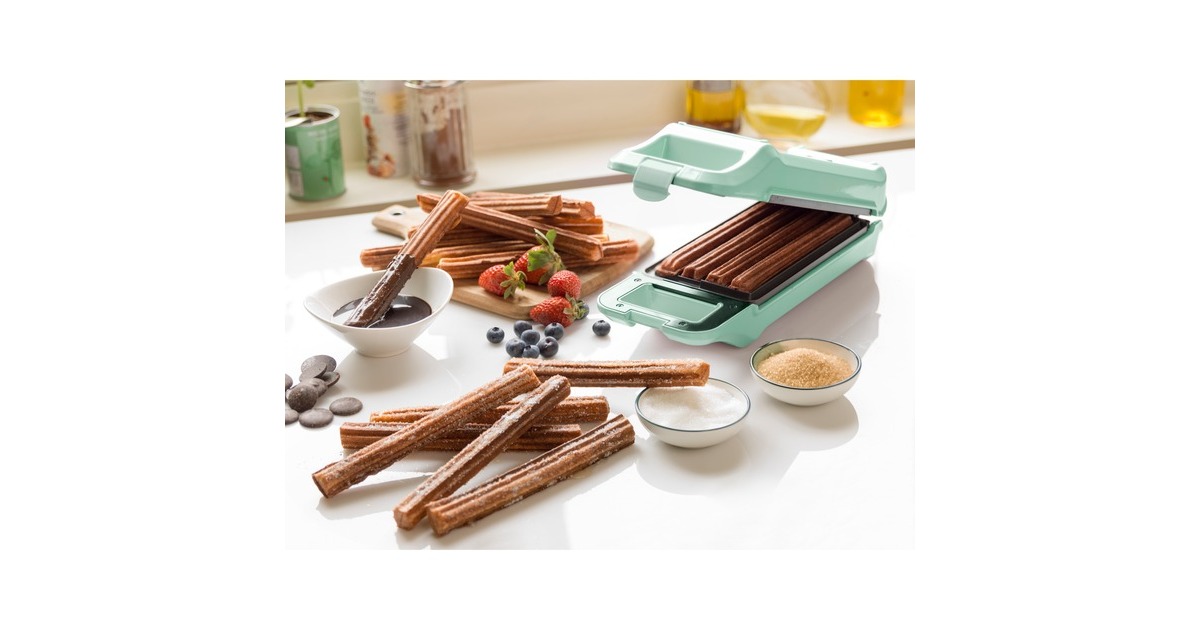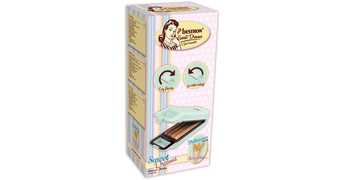 Mit dem Churros Maker ACHM200M von Bestron lassen sich im Handumdrehen 4 leckere Churros zubereiten. Für die Zubereitung ist, dank der hochwertigen Antihaft-Backplatten, kein Öl oder Fett notwendig. Die Flipover-Funktion sorgt für perfekte, gleichmäßig gebackene Churros. Für einen sicheren Gebrauch sorgen Antirutschfüße, ein hitzebeständiges Gehäuse und Griff, Überhitzungsschutz sowie die Backampel.