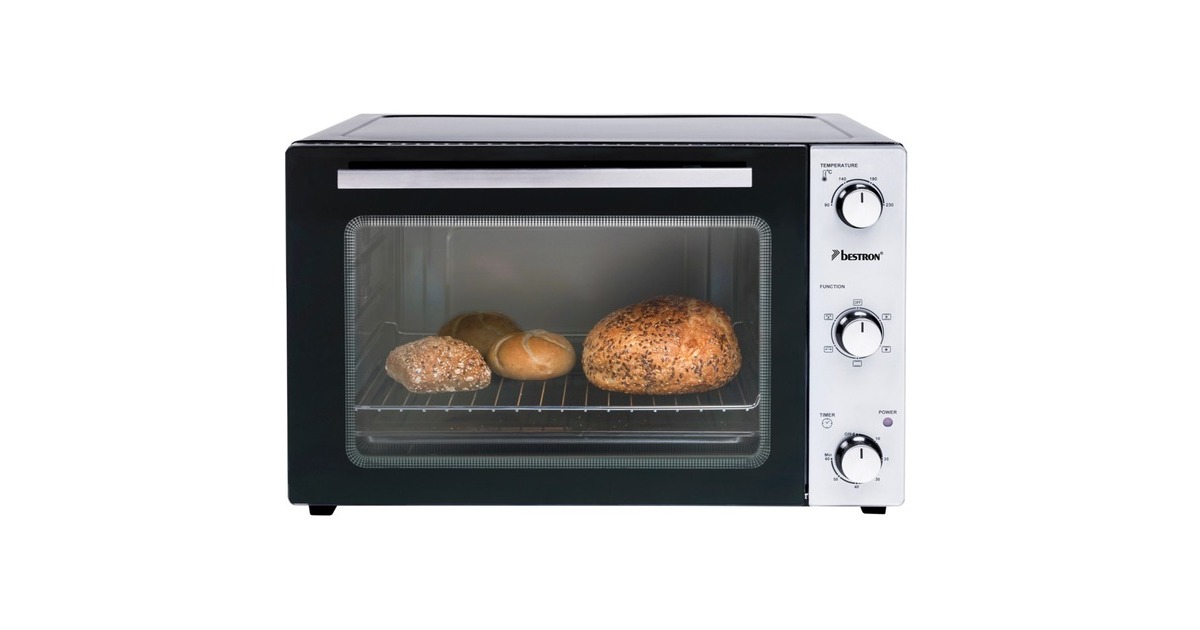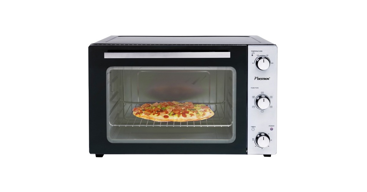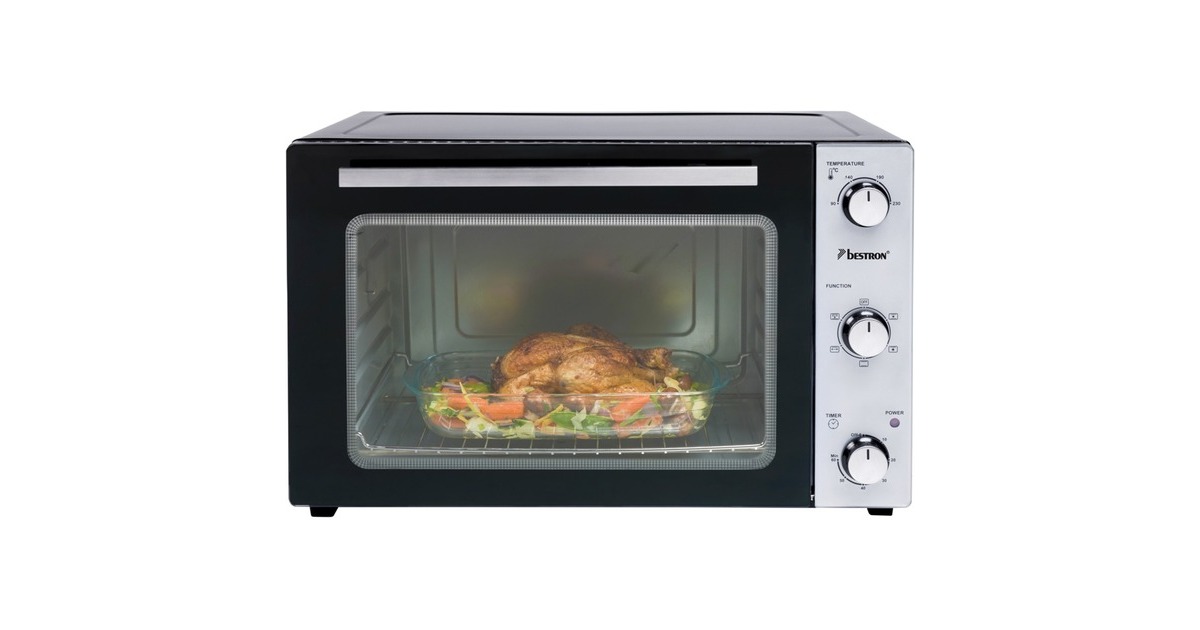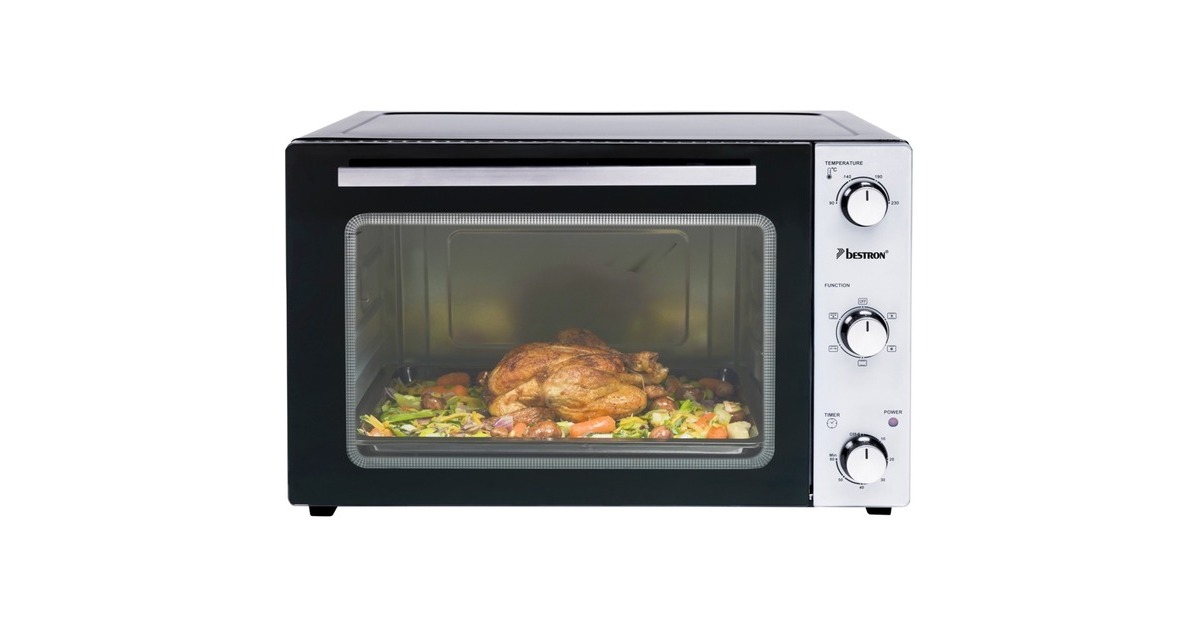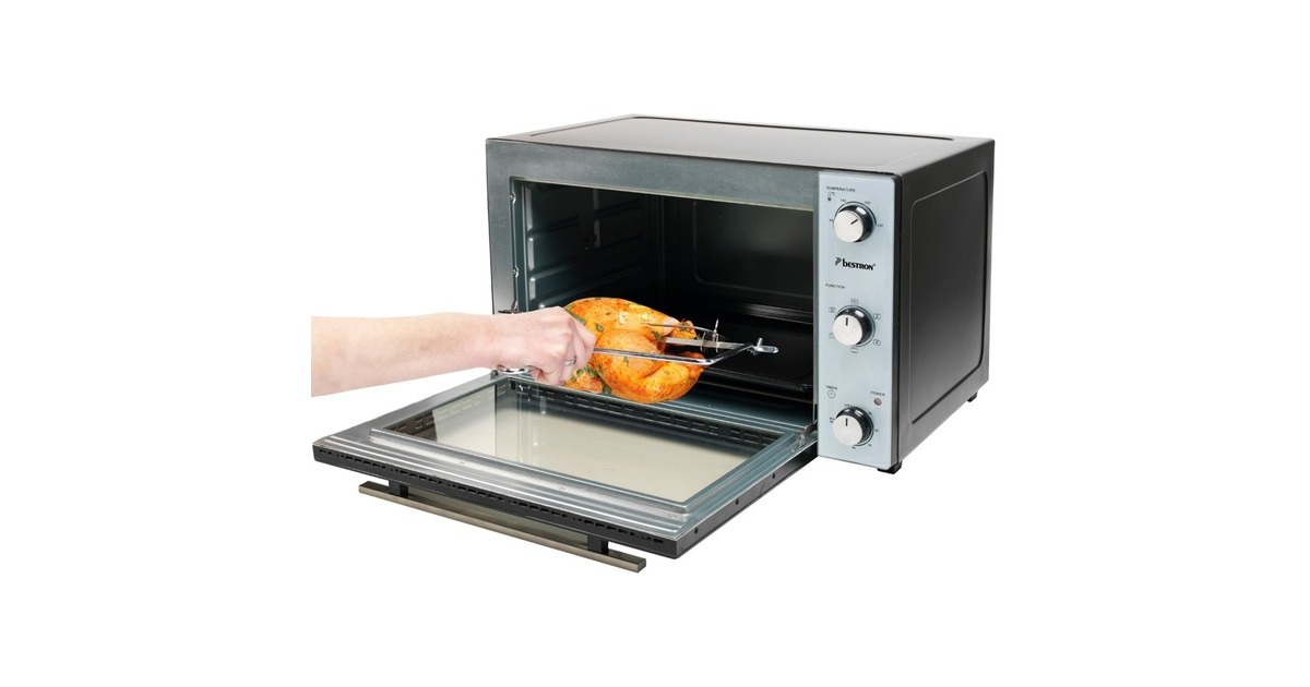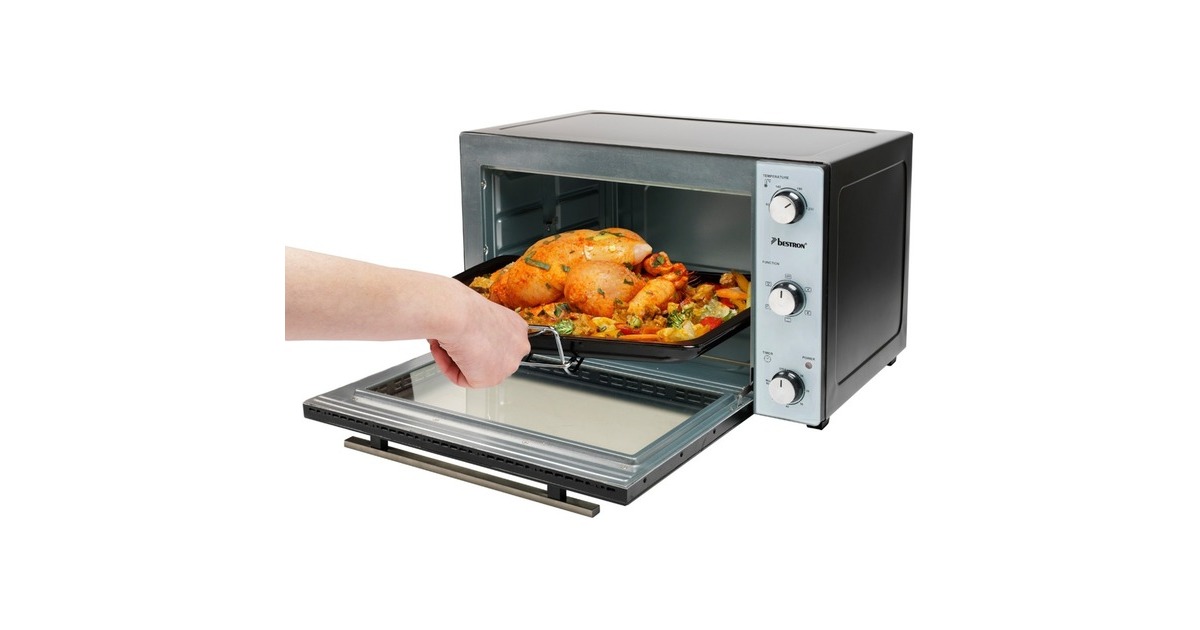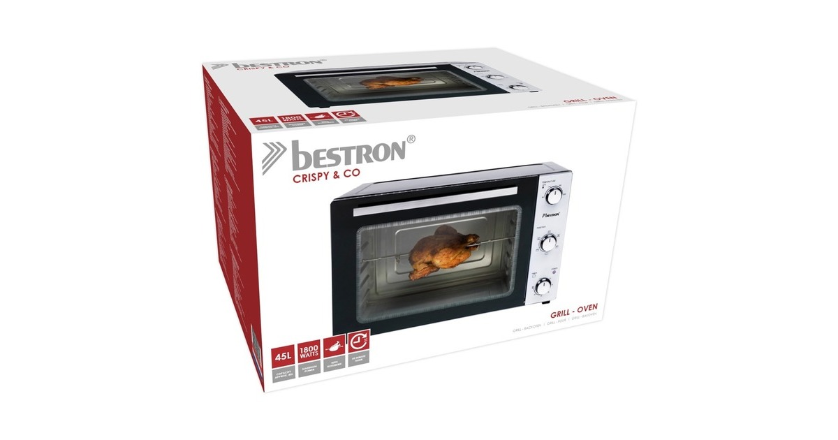 Der Bestron AOV45 Grill-Backofen mit Drehspieß, Ober-/Unterhitze und zuschaltbarer Umluft eignet sich wunderbar zum Zubereiten von Hähnchen oder zum Backen von Pizza. Im 45 Liter großen Backraum lassen sich auf einem Drehspieß Hähnchen oder anderes Fleisch garen und auf dem Grillrost oder emailliertem Backblech und praktischem Handgriff bequem Pizza, Flammkuchen oder ähnliches backen. Die Temperatur sowie die einzelnen Garprogramme lassen sich bequem über 3 Drehregler einstellen und der Innenraum des AOV45 Grill-Backofen ist einfach zu reinigen.Art.-Nr.: 1495004