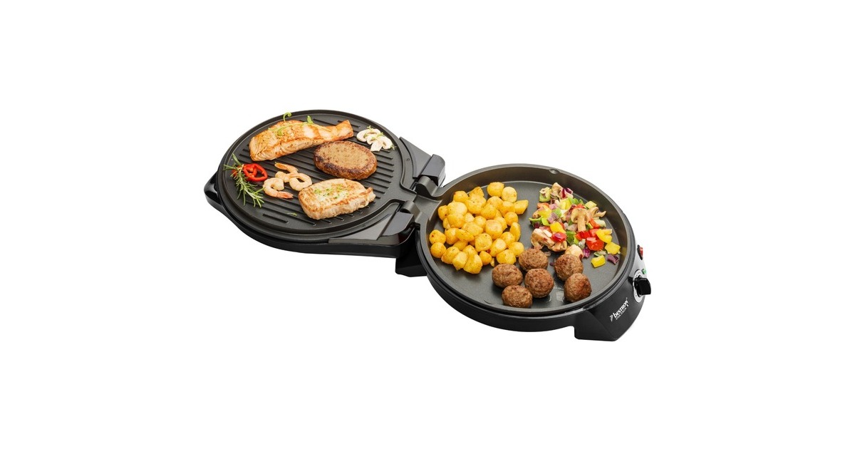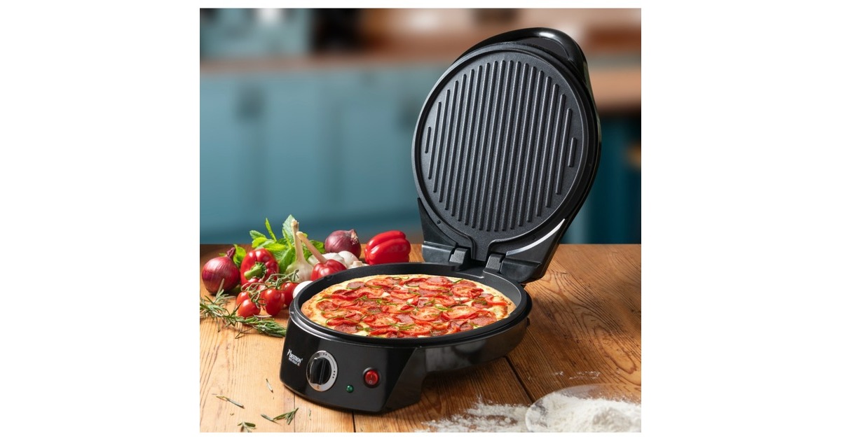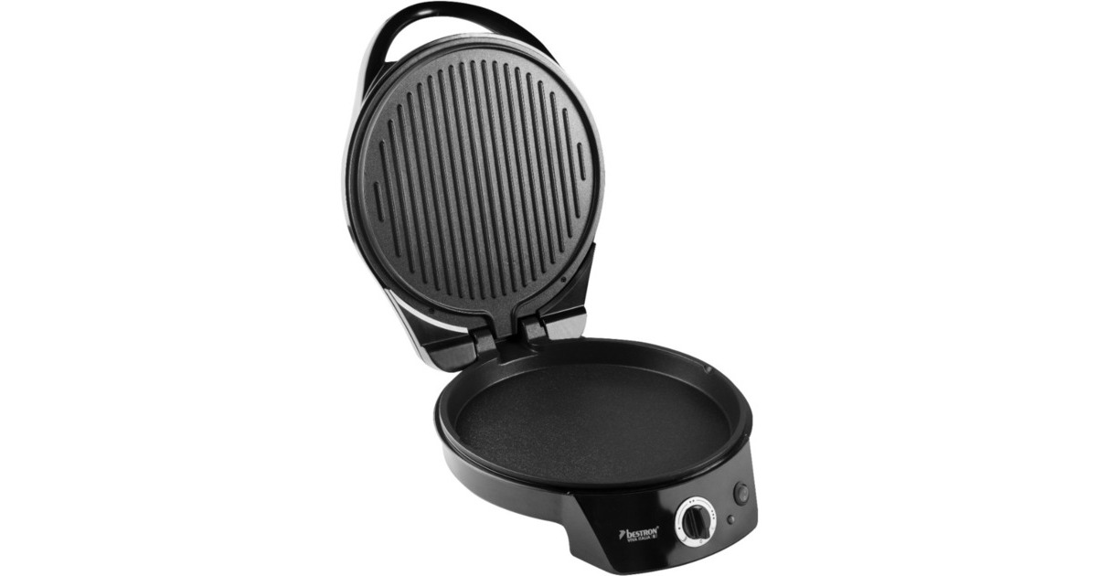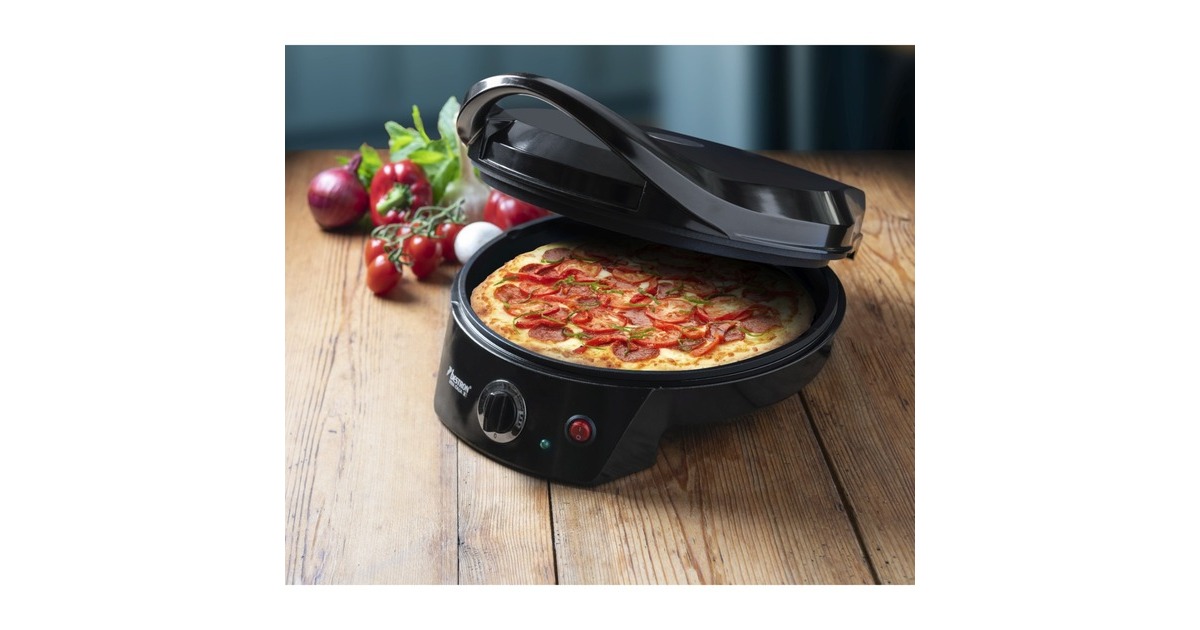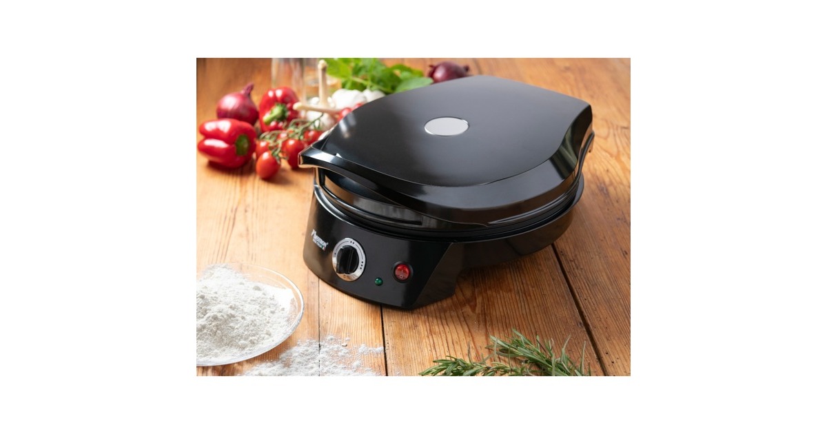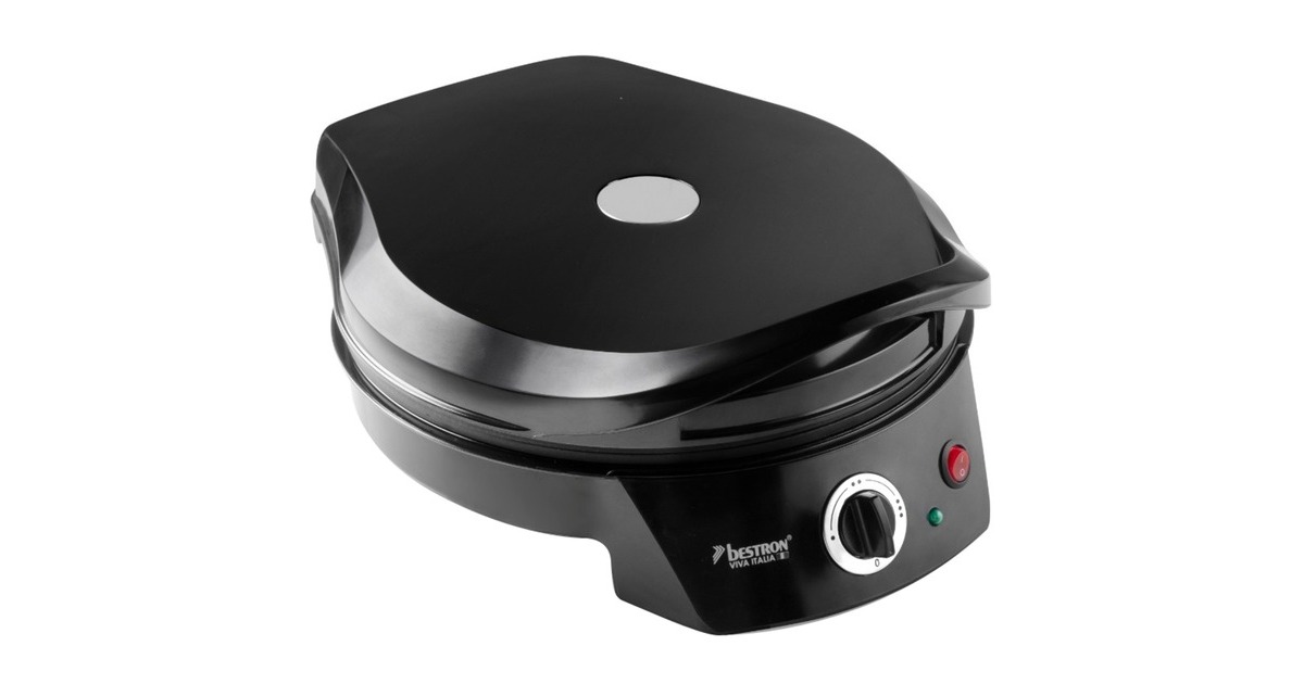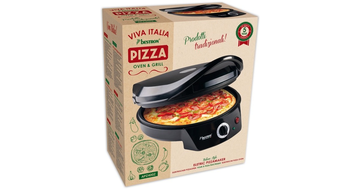 Der Pizzaofen von Bestron ist ideal für die Zubereitung von leckeren tiefgekühlten oder frischen Pizzen (Ø 27cm) innerhalb von nur ca.10 Minuten. Dank 1800 Watt heizt der Ofen innerhalb von sieben Minuten auf. Er eignet sich nicht nur für Pizza sondern auch für türkische Pizza, Flammkuchen, Quiche oder zum Aufwärmen. Aufgeklappt und durch die beiden Heizelemente entsteht ein großflächiger Tischgrill. Die Antihaftbeschichtung erleichtert die Reinigung. Die Bedienung ist ein Kinderspiel, die Temperatur kann stufenlos bis 230° C eingestellt werden und eine grüne Lampe leuchtet auf, wenn das Gerät einsatzbereit ist. Mit Antihaftbeschichtung zum leichten Entnehmen der Speisen und zur einfachen Reinigung. Der Griff ist wärmeisoliert und die Antirutschfüße sorgen für einen sicheren Stand. Art.-Nr.: 1875377